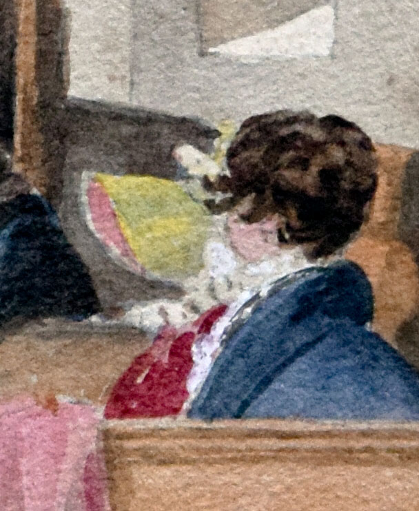 So what might we make, finally, of the figures to the right? We have already noted the privileged position of the Countess of Pomfret’s box pew. There was no-one more eminent in the parish than her, so the figures to the right, in boxes directly opposite the Countess, must be special guests, celebrants, or family of the vicar. The couple in the foreground have the greatest prominence, and by virtue of that have some implied role in the occasion of the watercolour. They must be married to be sitting together unchaperoned, but only recently so to judge from their apparent age. We can tell little of her except through her beautiful outfit, but he is quite distinct, and certainly in the prime of his maturity. The artist carefully delineates his thick, dark hair and pink complexion, and gives his bearing a sense of vigour. We cannot know for certain but it is tempting to wonder whether this might be David Twopeny and his wife, Mary. We have already heard a good deal about David Twopeny as the author of the main series of drawings in the portfolio (see parts #3ff). Mary was the youngest daughter of the Reverend Richard. Both were thirty years of age when they were married in Little Casterton Church on 29 May 1834. The watercolour answers well to that date if the identification of the Countess of Pomfret and her nephew is correct.