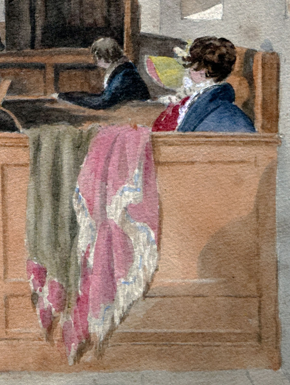 Opposite the pulpit is a large box pew, in which we can see the heads of two men and perhaps the blue bonnet of one woman. Beyond that is a series of lower pews, where we can see one woman seated wearing a red jacket and a brown (or yellow) bonnet. Finally, on benches against the far wall of the church are seated three or four more devotees. Two are women, one in a blue robe, another in red. Besides them is another figure, probably male, dressed in a grey or black jacket. Behind them is possibly a fourth figure, evidently dressed in a bicorne hat.