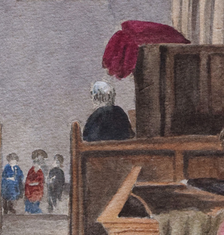 The artist appears to have felt the need to avoid direct portraiture, but nonetheless invests the figures with distinct character. Moreover, the paint handling is well above the normal level of an amateur. The treatment of light is especially impressive – the sunlight on the box pew in front, and atmosphere in the distant nave – all suggesting a well-trained visual imagination, and a determination to properly inform and consider each effect in detail.