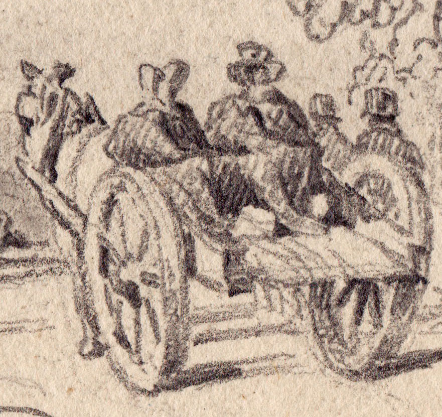 All this is to presume that the drawing should offer some recognisable relation between what is drawn and what is depicted. For a drawing is not at all like a photograph and it is only in the hands of competent draftsmen working in a tradition that only really began in the later eighteenth century that we can have any expectation of such relation in art. It seems plain, in any case, that the drawing is too elaborate and considered to have been made on the spot. The cart would have had to remain stationary for an inordinate length of time. Rather the effect of instantaneity is entirely synthetic. The configuration of figures and cart especially must be from the imagination. An imagination informed by knowledge and memory, but imagination nevertheless.
