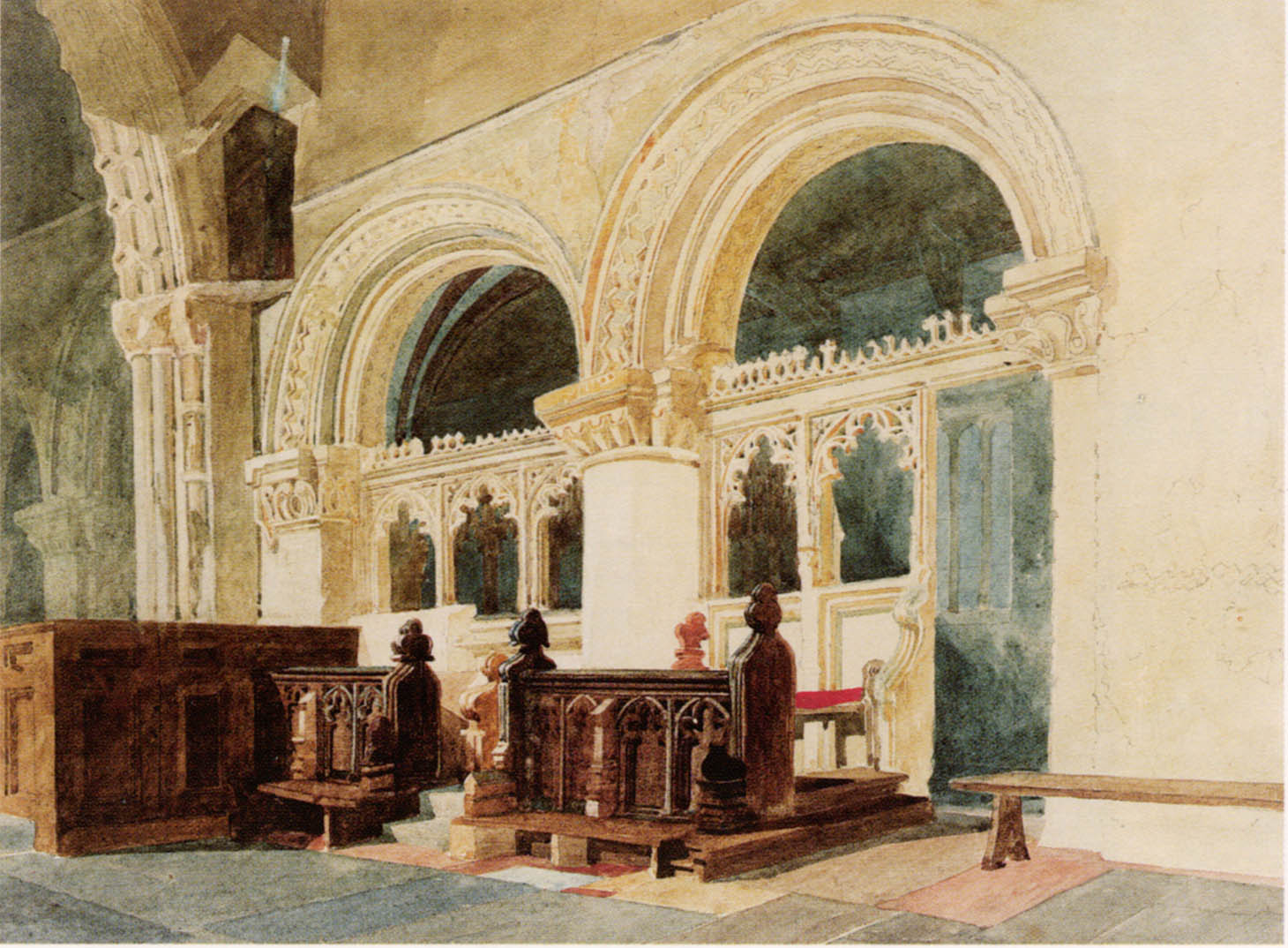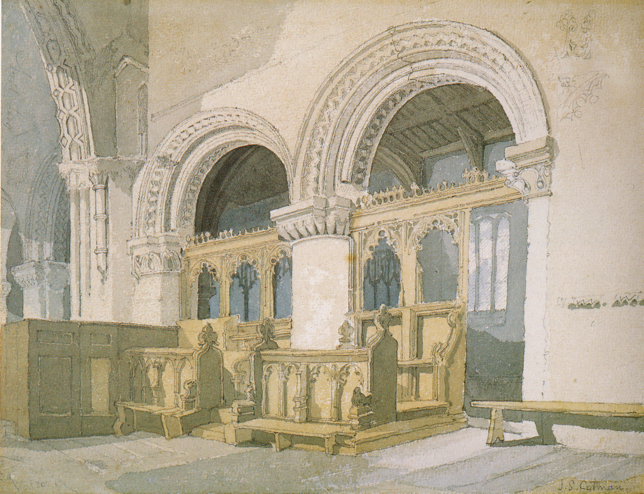 The problem is that it is by no means certain what might have been the source from which this was taken. It differs in detail from every one of the Cotman examples. There are minor differences everywhere, but the most important seems to be the difference in treatment of the vaulting seen through the central arch. The Cotman versions are consistent with one another, but this differs. Another significant difference is the shadow under the bench at the right. Every one of the Cotmans, makes subtle play of this detail. The only exception is the Chris Beetles version, in which the shadow is absent as here.