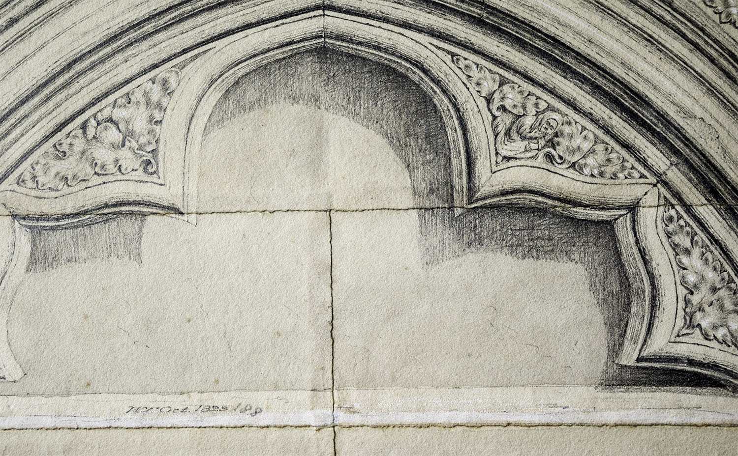 The subject is as inscribed on the verso, ‘Monumental Arch/ Navenby Church/ Lincolnshire’. Navenby is nine miles south of Lincoln on the road to Grantham. More particularly the arch is that of The Founder’s Tomb, situated in the north wall of the chancel of St Peter’s Church. The term ‘Founder’s Tomb’ generally refers to a monument to someone of particular importance to a church. In this case the tomb is thought to be that of the Parish Priest, John de Fenton, dating from around 1331, not long after the completion of the chancel in which he lies. The decoration is typical of the flamboyant and exceptionally sophisticated style of the Decorated period of Gothic, drawing deeply on natural and greenwood imagery.
