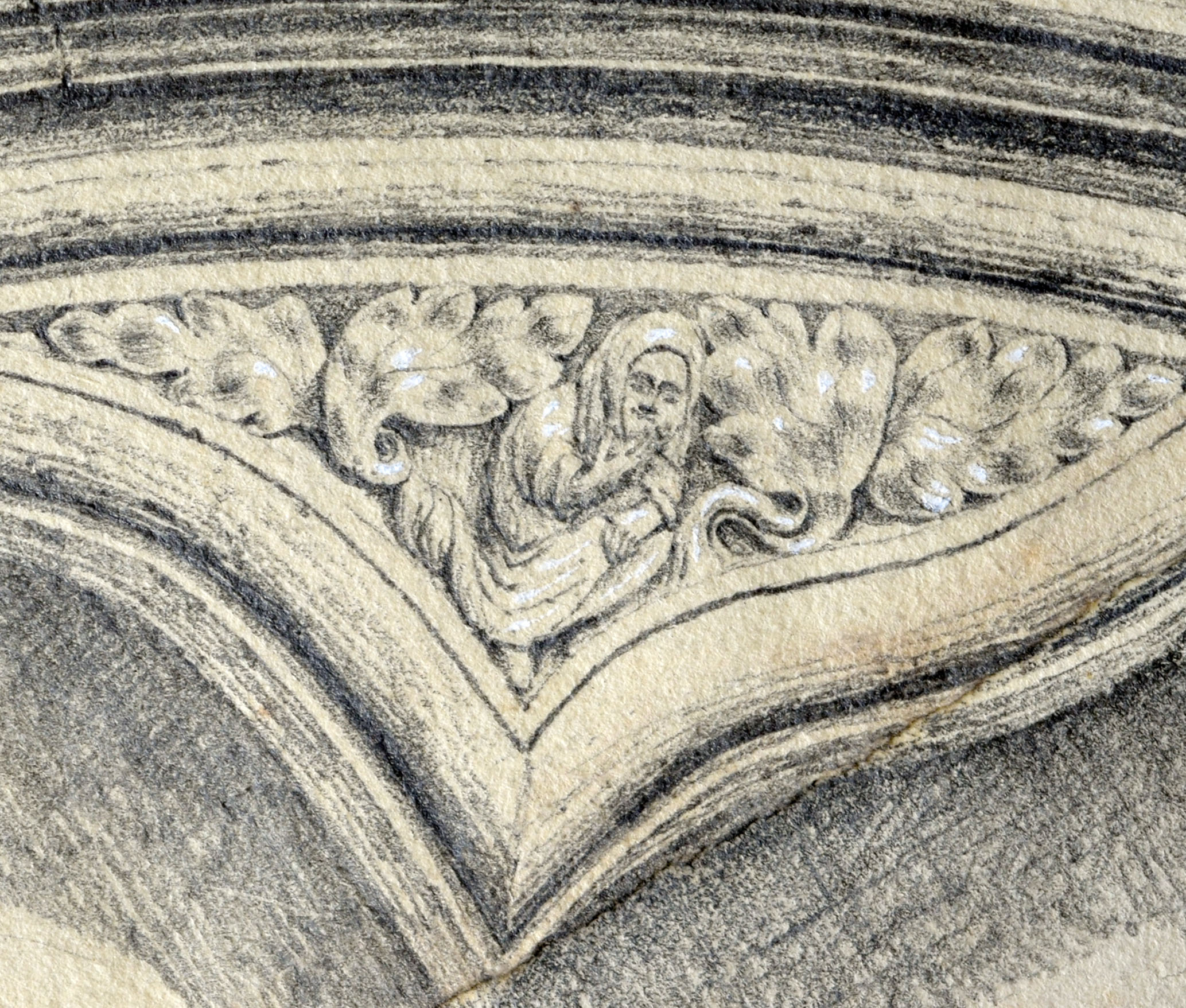 William Twopeny was twenty-six at the date of this drawing, and on this evidence already a highly accomplished draftsman. I have not managed to discover where or with whom he trained, but it seems obvious that his technique is influenced by close observation of etching. The way in which the shade under the niches is built up from multiple lines is exactly that of line etching. On the other hand, the involuted forms of foliage are modelled in an entirely different manner using finely graduated tone. We know from examples at the British Museum that William Twopeny worked on many of his drawings twice. Firstly at the time of his visit to the sites, and then later in life he developed them with richer tone. That seems also to have happened here.