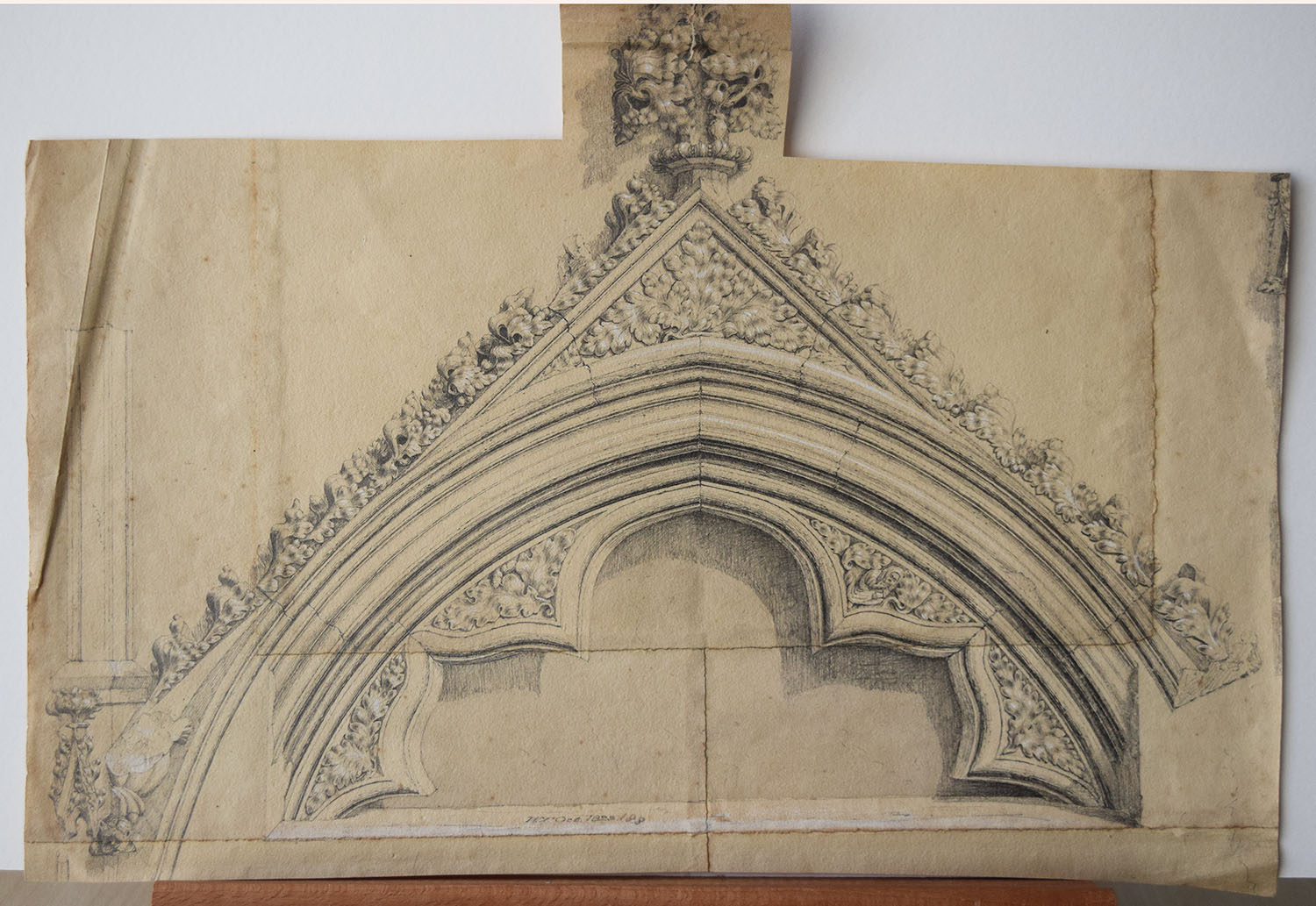 This is a carefully elaborated drawing of a heavily decorated niche. The sheet appears to have evolved in size, the first part being the upper part of the arch, then the lower centre and finials to each side, the right hand finial [at least] having been drawn whole, but subsequently trimmed.