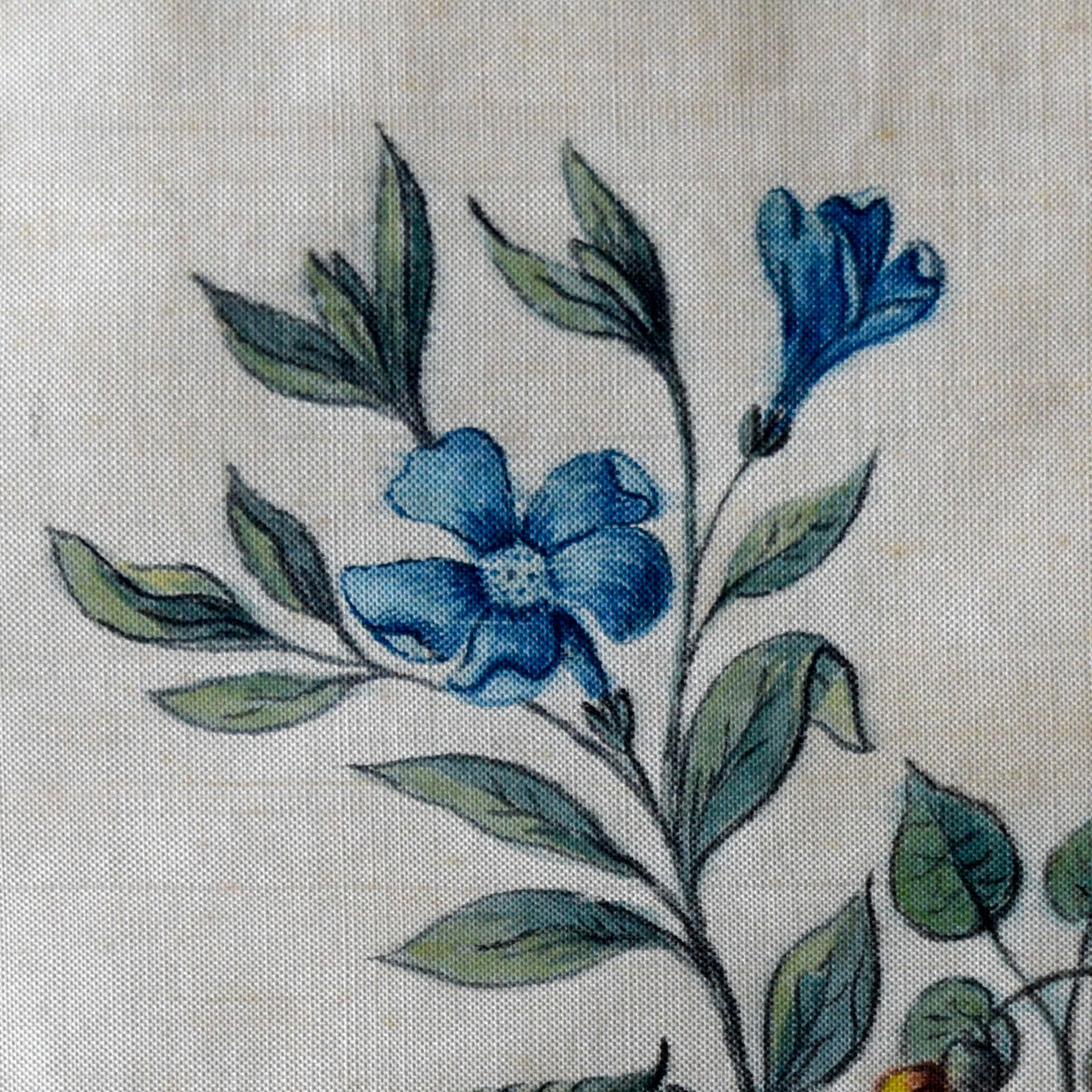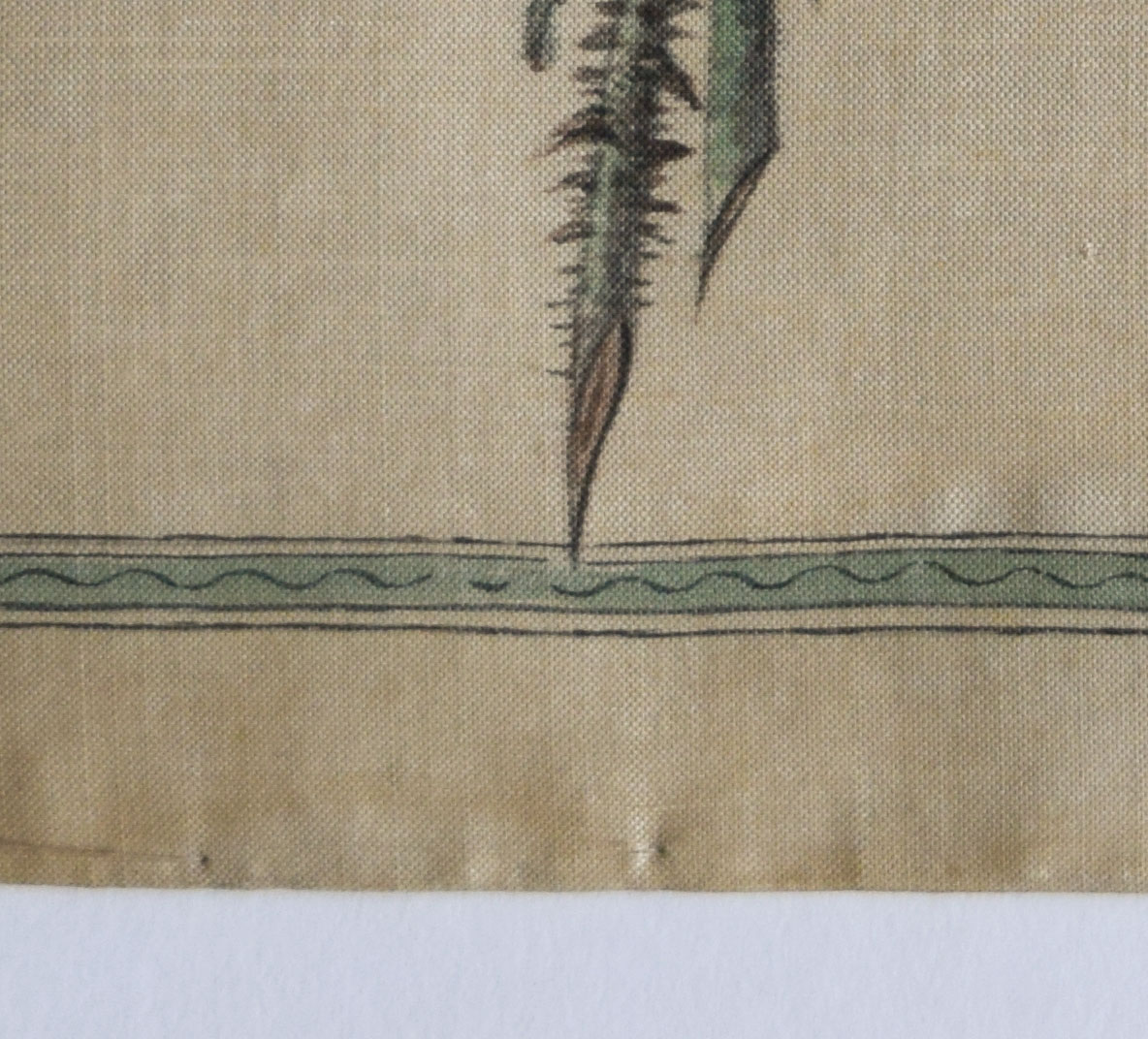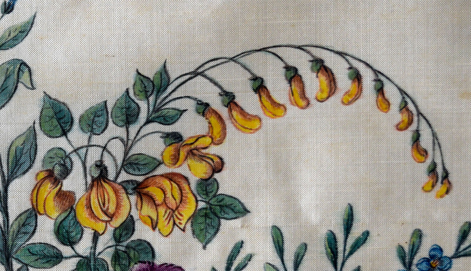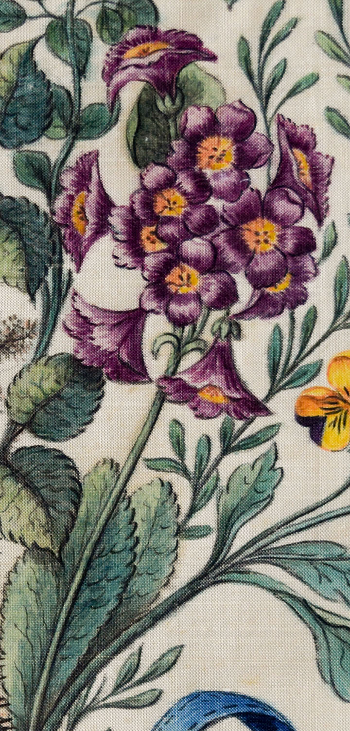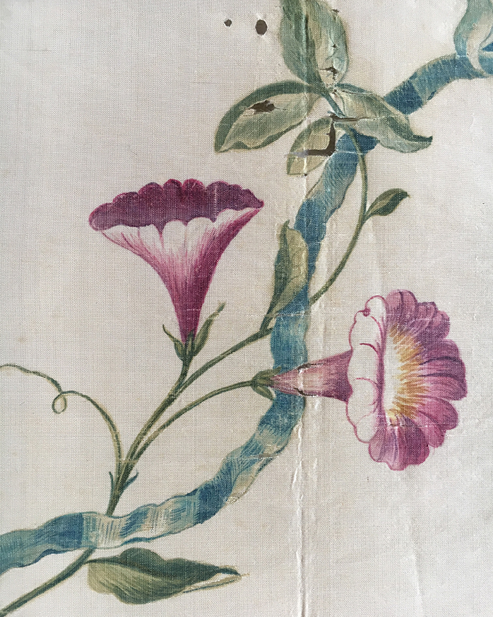 The style is a little different. The present example suggests a more accustomed hand; as if our artist applied themselves regularly to this kind of work. Phoebe Holmes, on the other hand, appears to have been an amateur, and Meg Andrews suggests that her fabric might even have been painted for a wedding dress.