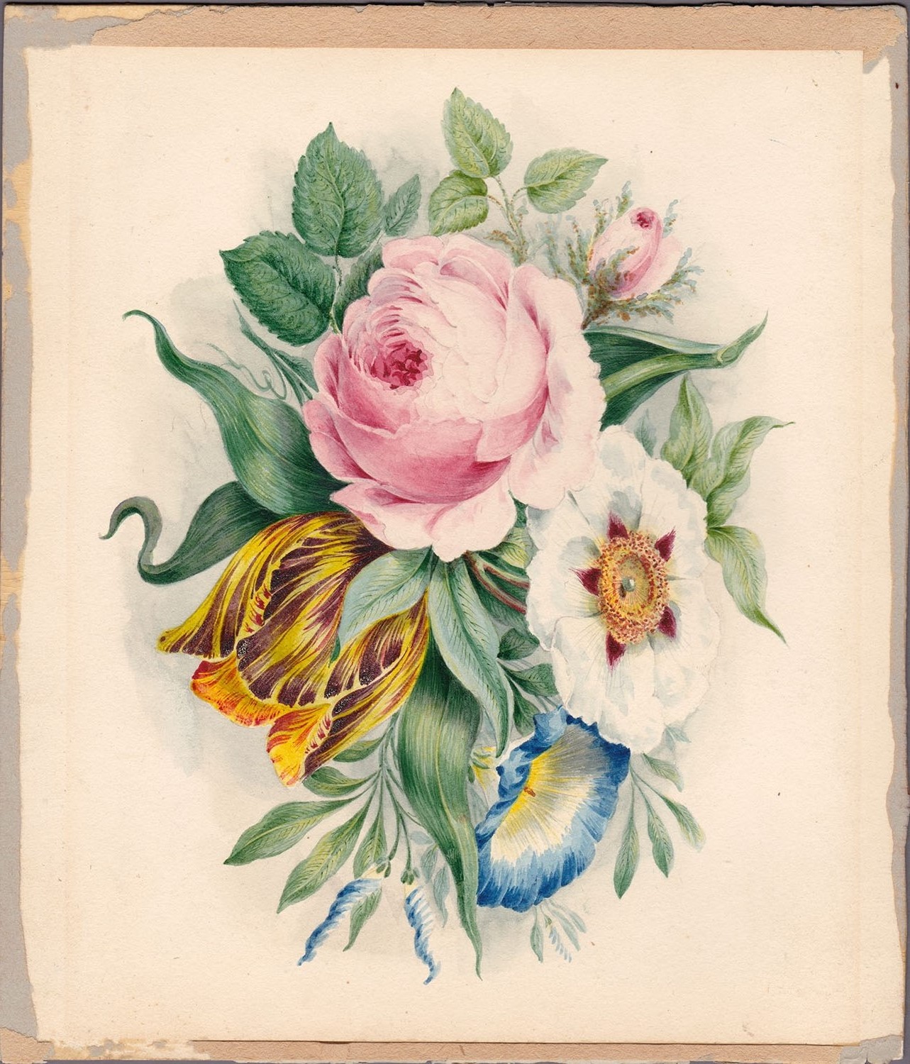 A Bouquet of flowers, comprising of white rock rose, blue morning glory, yellow and brown striped tulip, and pink rose, c.1820?