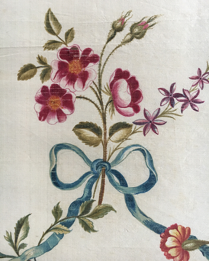 It appears that the fashion for pale cream and ivory silk sprinkled as it were with isolated motifs of posies and arabesque bouquets was at its most fashionable in the 1770s. Killerton, Devon has a wonderful dress from 1770 made with hand-painted silk imported from China.