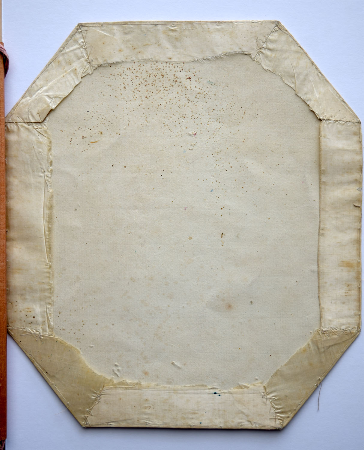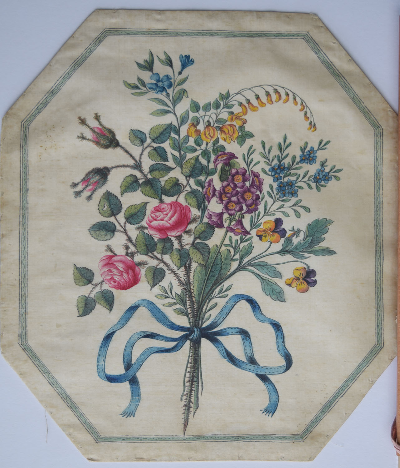 The octagonal shape and intended soft context of the 1816 piece compares to the present example, but the fact that the fabric is actually stitched to the card round the edges is very specific. Meg Andrews offered the suggestion that this must be for presentation for framing. My independent floral adviser, Lesley Dove, supplements botanical expertise with skills in stitching and sewing, and Martin Dove, her husband knows a good deal about framing. They offered exactly the same advice.