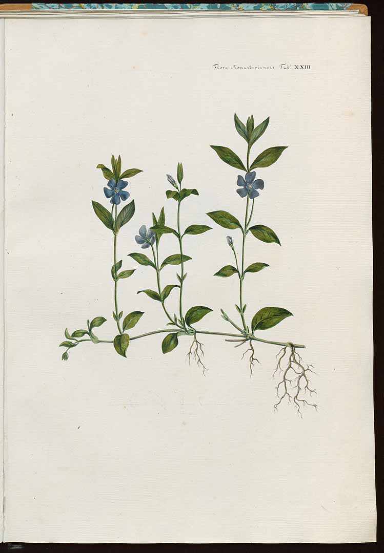 Next, at the top is a blue, five-petalled flower with a blue centre. This can be identified as a periwinkle, vicus minor. The splendid website http://www.plantillustrations.org, is a outstanding research resource for historical botanical illustration:
