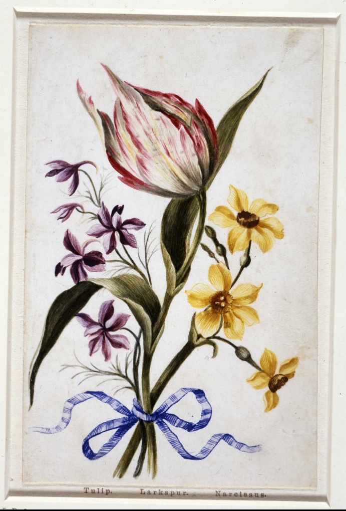 The design concept, a simple bouquet laid out against a plain background and tied with a ribbon seems to date back at least into the seventeenth century. There is an album of flower drawings by Alexander Marshall [or Marshal] at the British Museum that provides almost the archetype of this motif.