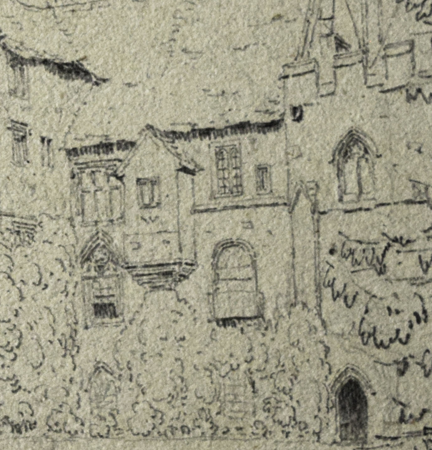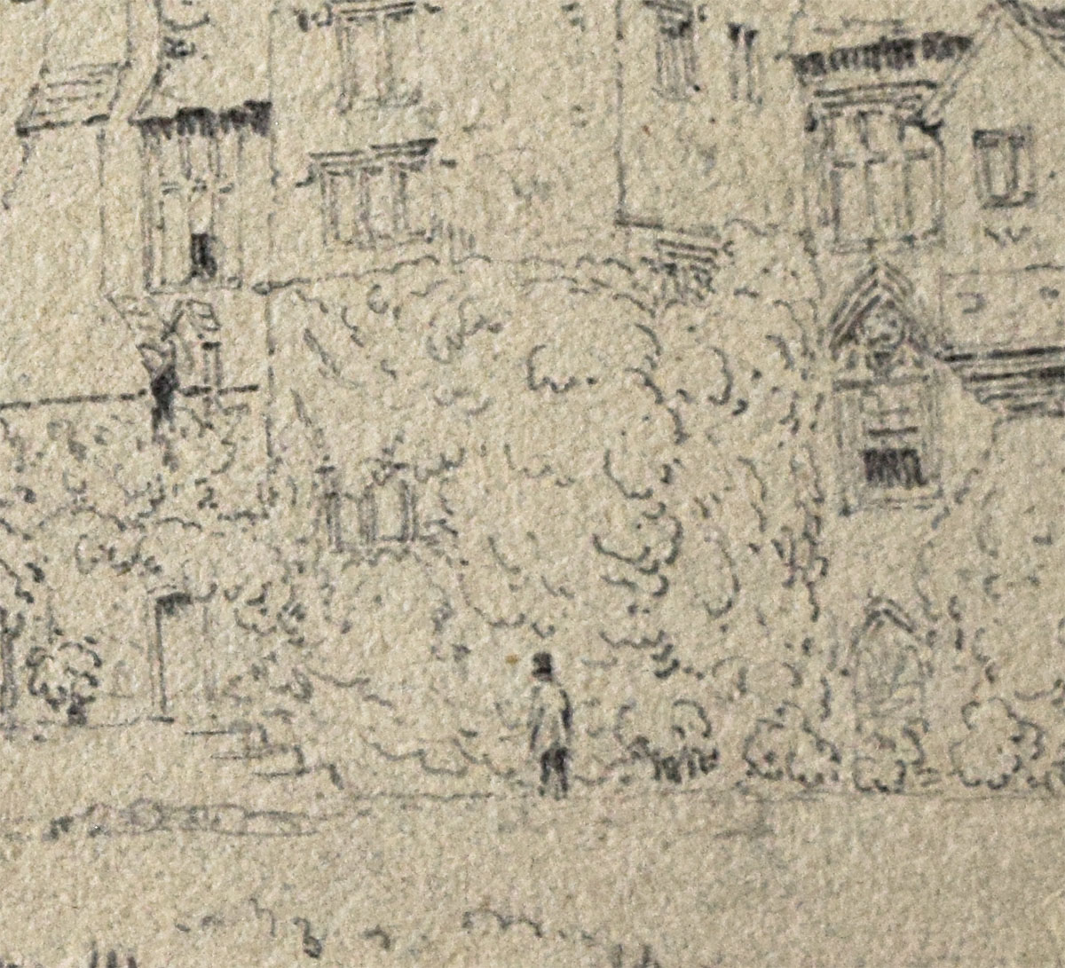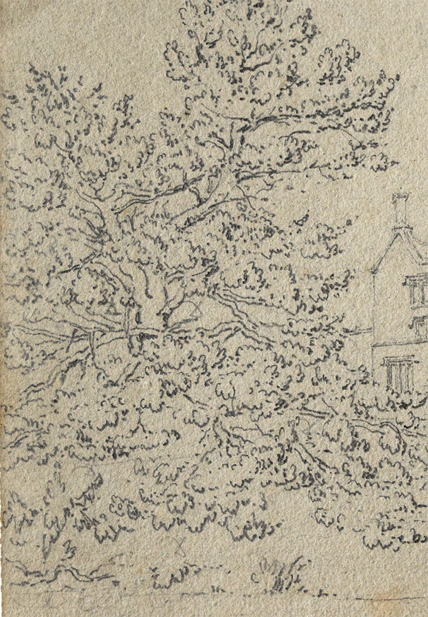 There is no indication of date on this drawing. It is more mature than the drawings already considered of 1824, and unique in the series in being drawn on toned paper. David Twopeny took his master of arts at Oriel College, Oxford in 1827 and it seems possible that the present drawing was made on an expedition from his alma mater. The style is very accomplished. It is a fine example of the style of drawing, characterised by hooks and dashes in the vegetation, and clean, brilliantly placed line work, that was popularised in the 1790s by Edward Dayes and his circle, and adopted by a generation of professionals and amateurs in the later 1790s and first couple of decades of the nineteenth century.