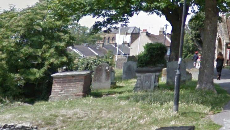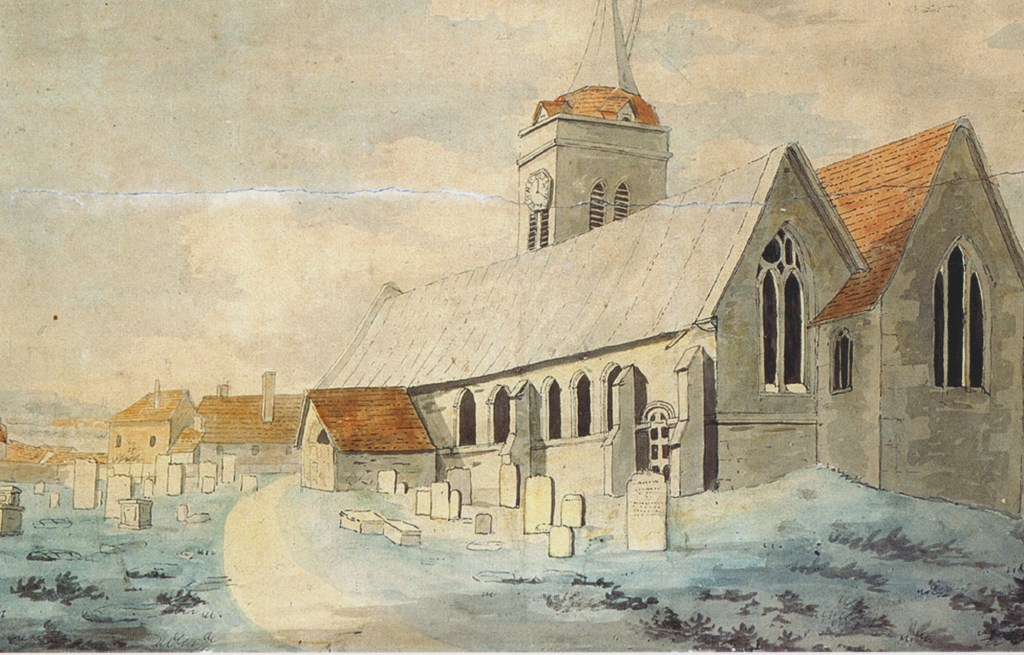 Turner’s view is very well preserved, except for the fact that the church spire is now more substantial. Even admitting the uncertain handling of perspective [as Thornbury observes] it is certainly worth remarking that the quality of detail and observation is already impressive. It seems probable that the accuracy extends even to the record of individual tombstones in the churchyard, and any differences in detail in the architecture of the church might be accounted for by a fairly comprehensive restoration of 1875.