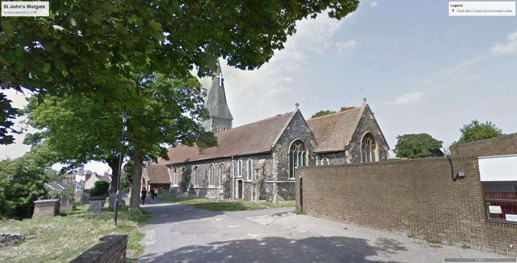 The subject is the south-east view of the Church of St John at Margate. The church stands on a rise in the southern part of the town.