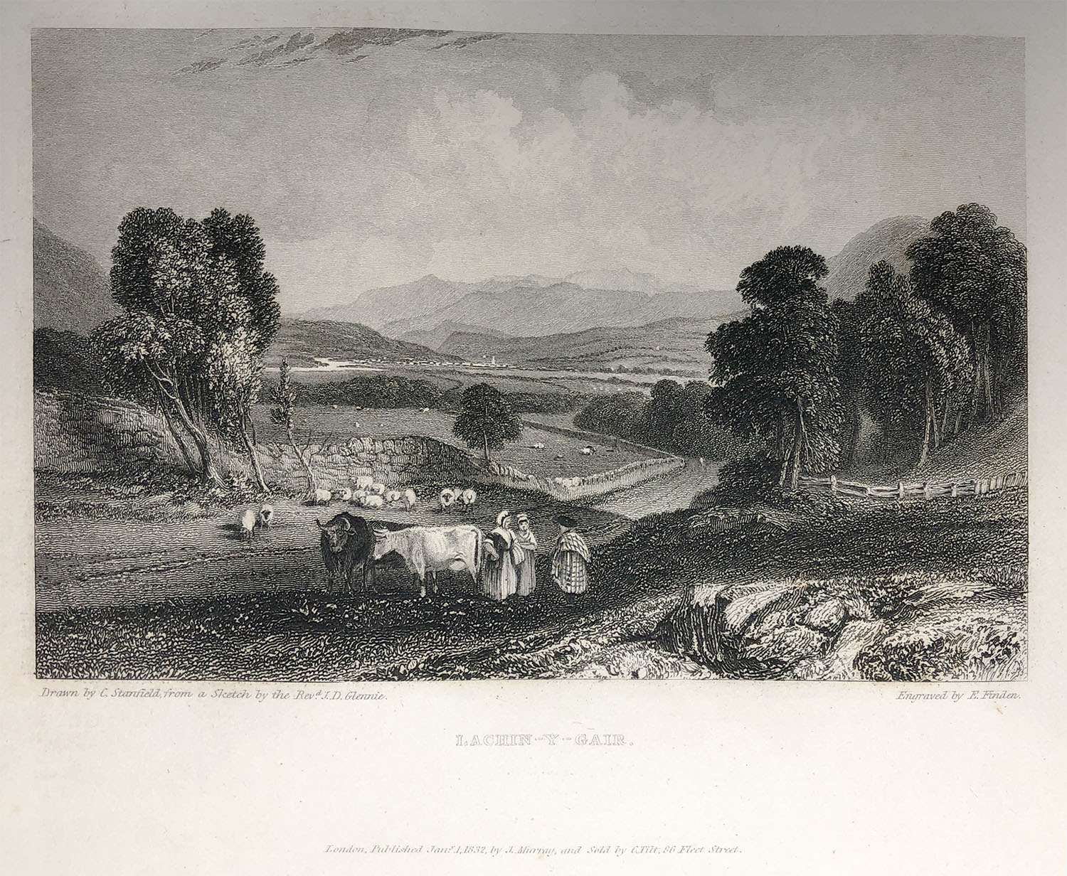 Inscribed in lower margin, immediately below image left in small italic; ‘Drawn by C. Stanfield from a Sketch by the Revd J.D.Glennie.’ and right, ‘Engraved by E. Finden.’ Titled in small open caps lower centre, ‘LACHIN-Y-GAIR’. Publication line in small italics below, ‘London. Published Jany. 1 1832 by J.Murray and Sold by C.Tilt, 86 Fleet Street.’