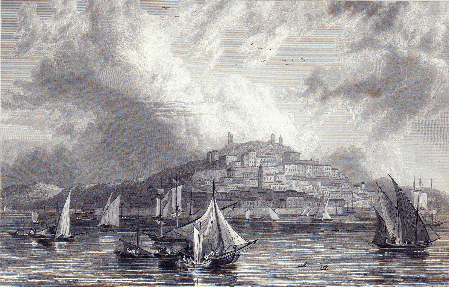 The engraving shows the view of the city and citadel of Cagliari from the harbour. Despite a very great deal of subsequent development, the scene is recognisable in character and in some detail today.