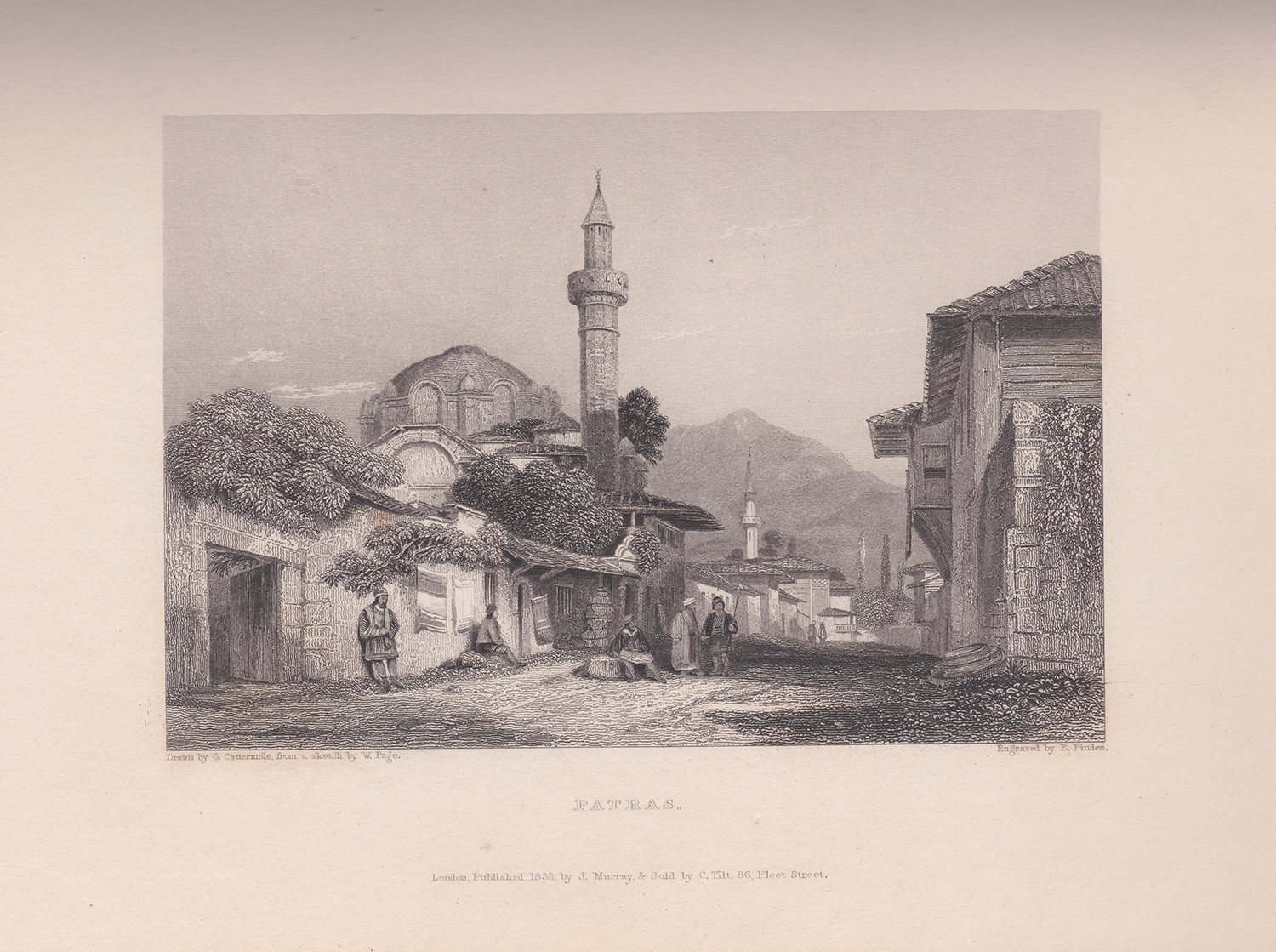 Inscribed in lower margin, immediately below image left in small Roman; ‘Drawn by G.Cattermole from a sketch by W.Page’ and right, ‘Engraved by E. Finden.’ Titled in small open caps lower centre, ‘PATRAS’. Publication line in small Roman below, ‘London. Published 1832, by J. Murray, & Sold by C. Tilt, 86, Fleet Street.’