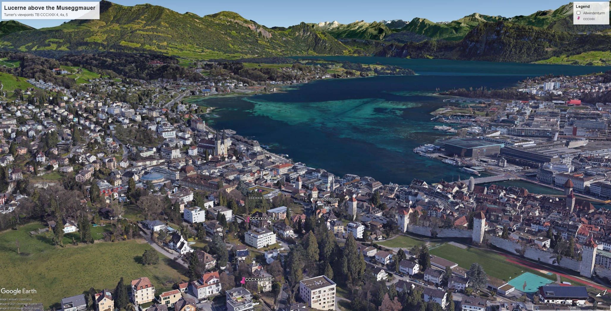 In the previous instalment we saw how Turner triangulated the geography of his sketches using landmarks and parallax. Here he keeps the spires of the Hofkirche and Mont Rigi in a steady line of sight, and retreats to successively higher viewpoints.