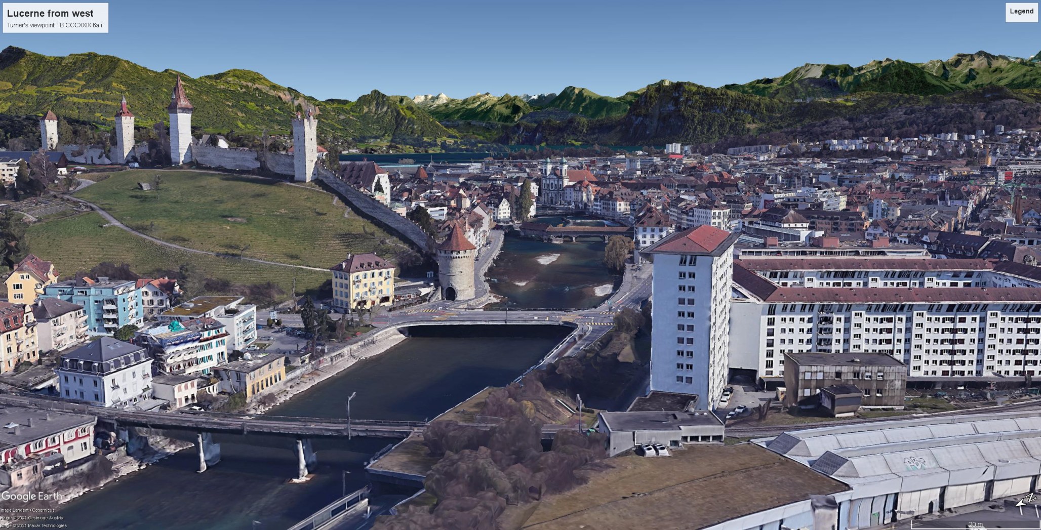 The second sketch, in the upper register, records the view from about half a mile further downstream, close to where the river swings to the north, giving his most distant view of the city, with the whole line of the Museggmauer profiled against the Rigi, and the Gutschwald above the river to the right. The viewpoint of the sketch is also comprehensively built over, but glimpses of Turner’s material might possibly still be obtained from the slopes of the Zimmerweggwald rising above.