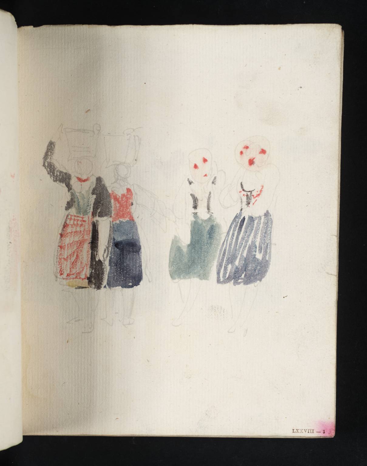 Though he could easily be distracted. Amidst all this sublimity, the ladies of Lucerne were abroad and he seems to have given the greater part of his attention to them. The conjunction reminds us that Turner’s landscape was human and social as well as geological. A line of women in regional dress, possibly taken on a Sunday as they went to church, or perhaps on a holiday or festival. In this, as in many things he was remembering the landscape of his own younger days. He sketched similar groups of figures on his first visit to Switzerland in 1802 in the Swiss Figures sketchbook.