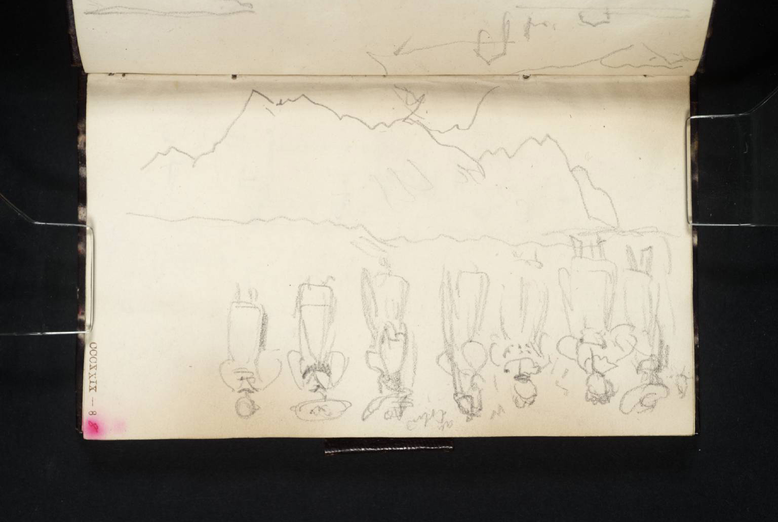 Here we continue our journey through Turner’s Between Lucerne and Thun sketchbook. Having completed a survey of the town in previous pages, Turner now takes a panorama of the mountains over the lake, but ends up paying closer attention to the ladies on the promenade.