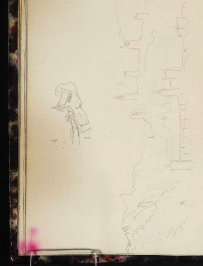 Before leaving this page we should pause to consider a detail. This is a little hard to make out, but with the page turned to portrait format, this might be understood as a figure leaning over a tiller or an oar. Many of the lake rowing boats at this time were guided by an oarsman (frequently a woman) standing at the stern. This might be a clue that Turner took a rowed boat for this crossing rather than the steamer. That would have given him more leisure and a more restful ambience for making sketches. We will encounter the delights of rowed lake crossings later on in this same sketchbook.