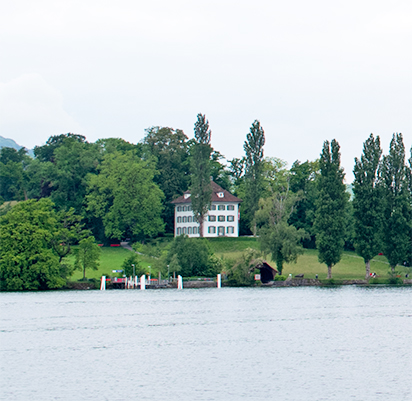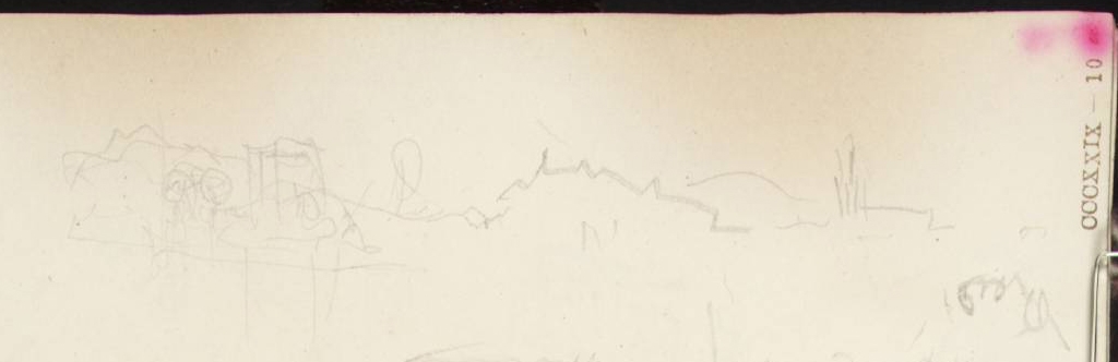 Turner’s final two sketches of Lucerne, both currently called ‘View on Lake’, are taken as the boat approached and rounded Tribschen point, a little over a mile from its depature point. In the main sketch Turner makes an exaggerated sweep round the shore to include Mont Pilatus at the left, and in the second, the final glimpse of Lucerne as the boat rounded the point.