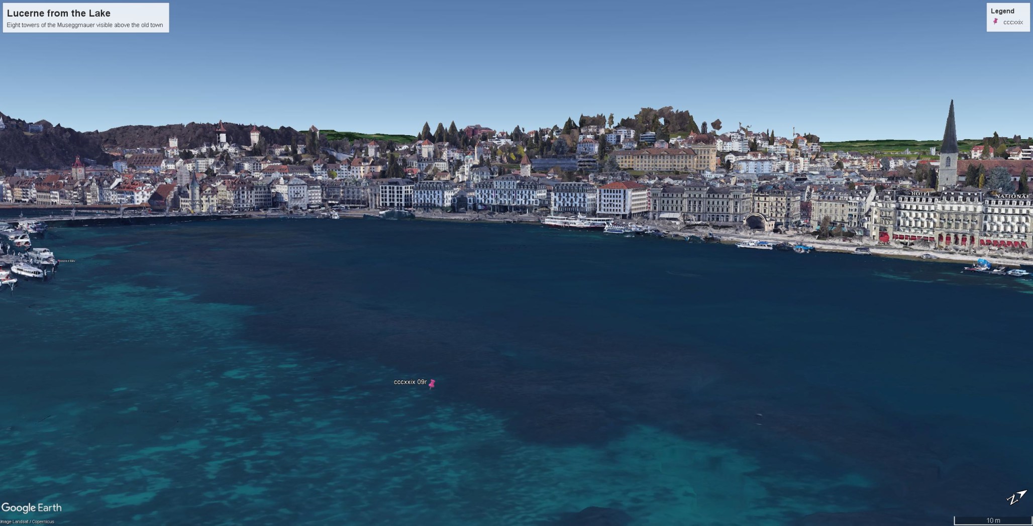 Turner took five sketches of the receding town. None are identified as Lucerne on Tate’s current online catalogue. The present sketch is simply called ‘Town beside lake’. It is taken from a position just off the present-day Bahnhof quay, looking (from left to right) to the Jesuit church, the Wasserturm, the Rathaus Clock Tower, the Tour Baghard and Swan Hotel, with the towers of the Musegg wall behind. The view is continued to the left above left with the Gutschwald and one of the former towers on the left bank, and to the right above right to include the Hofkirche.