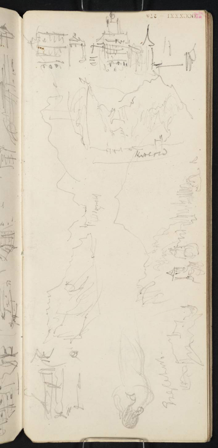 1) The Wasserturm and Kapellbrucke, Lucerne, from the north end of the Reussbrucke, with the Rigi behind and the Jesuit church to the right with an additional detail of the Jesuit church above left, continuing the sketch on f.27a, opposite, to the right. The same material sketched from the quay, further right, in (3-4) below. The Rigi appears behind the Wasserturm only from the north end of the Reussbrucke.