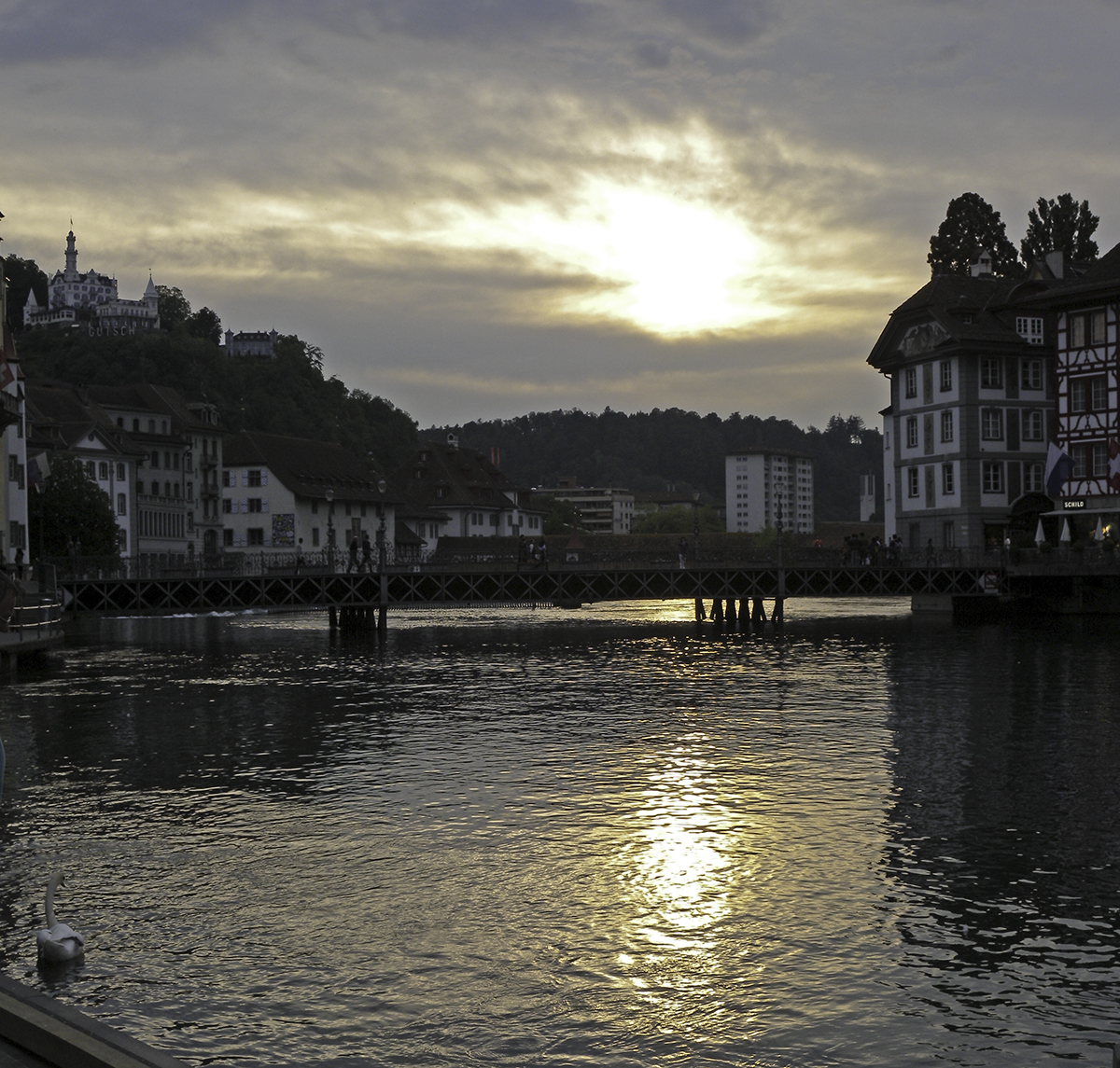 2) Looking down the Reuss from the Reussbrucke, Lucerne, to the Spreuerbrucke in the mid-distance, the Gutschwald above left and the towers of the Musegg wall descending to the river from the right. With the sun setting directly down the line of the river.