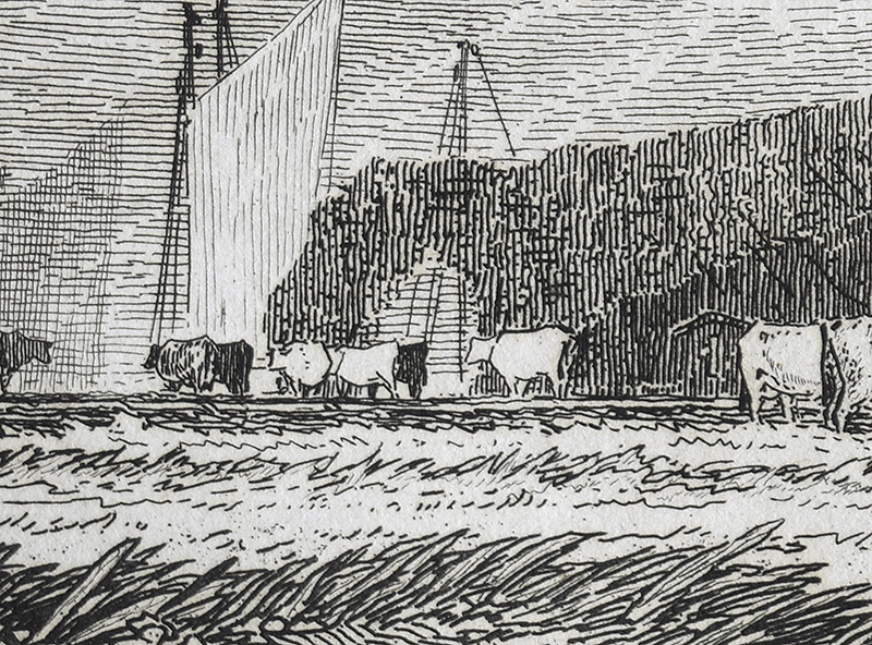 Besides these, but also unknown to Andrew Moore in 1982, is an oil painting sold at Sotheby’s 11 July 1990 no.96 attributed to Miles Edmund Cotman. This is a closely related, and substantial treatment of the subject, developing the atmospheric effect and skyscape to some effect. Comparison of detail shows that the design is tighter in the etching, and even a small detail such as the cow seen through the gate, is more complex in conception in the etching, being behind the supporting spar, rather than in front. A second reproduction of this online at the Art9000 website, is less impressive than the earlier reproduction.