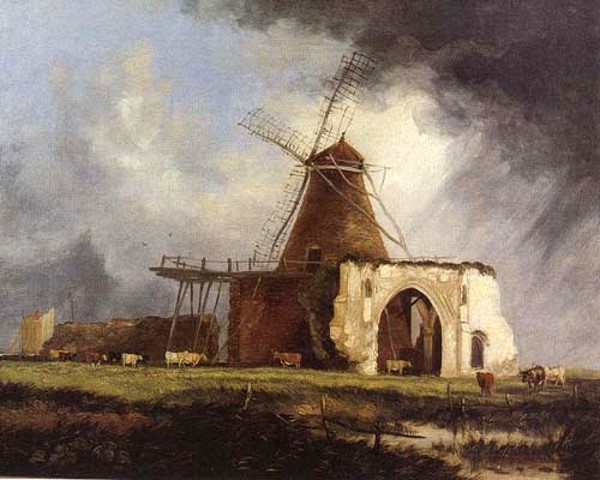 One final example for now; although there might well be many more to add to this list of works directly related to or derived from the composition and detail of the etching. Norwich Castle Museum has a watercolour by Thomas Lound (1802-1861). He was the scion of a wealthy Norwich brewing family, who became an accomplished amateur in the Norwich School of Painters. He was only eleven when the etching was published, but became a pupil of John Sell Cotman. His watercolour attempts to individualise the subject by turning the vanes around to the west, but the view of the gateway is the same as the etching, and Cotman’s tell-tale doorway remains, besides the too-close sails and weather effect to betray its true origins.