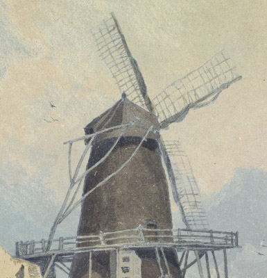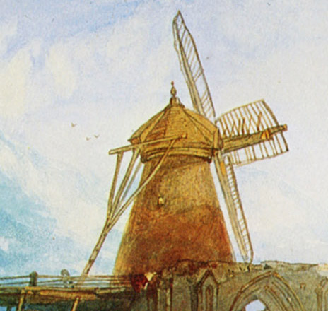 The most detailed published commentary on this watercolour is that by Andrew Moore in his Norwich Castle Museum catalogue of John Sell Cotman published in 1982, where listed as no.112. Moore, however, says that Cotman’s view in this case is from the north-west, a different viewpoint to the 1813 etching. This does not seem to be the case. In fact, the two are taken from exactly the same southerly angle on the gatehouse, but the chalk wall to the left of the previous compositions has been omitted here in order to open up the plain. Gone, too are the wherry sails indicating the previously imagined proximity of the River Ant. Finally, the vanes are turned to the right through ninety degrees to the north-east. The sails themselves also look rather more modern and in better repair than the rickety old simple sails figured in the etching.