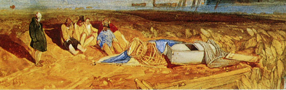 Leeds Art Gallery has a pencil sketch of two such craft, one of which (lower right) almost exactly corresponds with that in the watercolour. The mount of the Leeds drawing has been inscribed ‘Eel drogue’. I have not managed to discover how such a device might have been used in practice. Either way, their endeavours do not appear to be yielding much success. The men give off an air of dejection and discomfort.