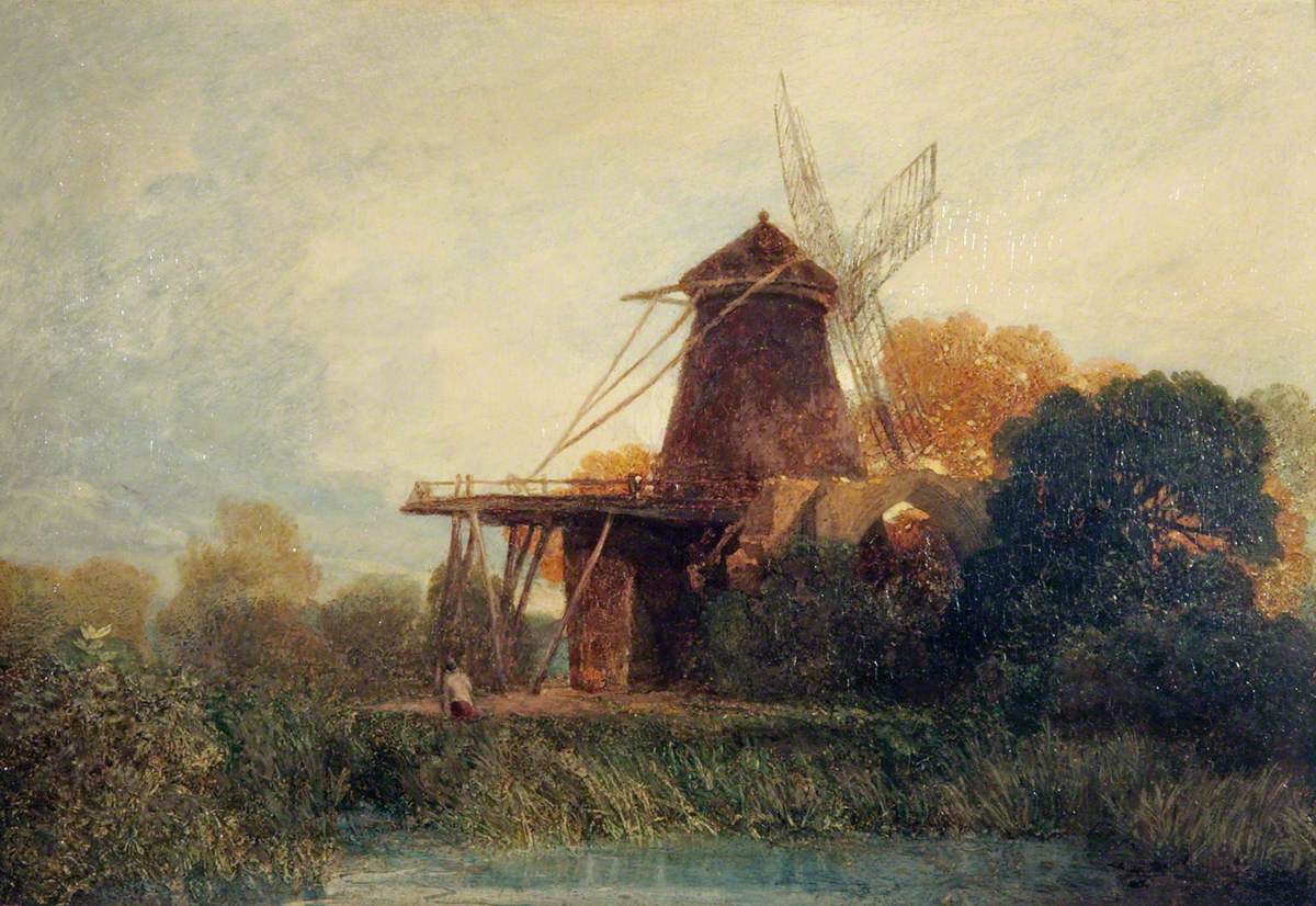 There is one key detail, however, that relates the Leeds composition directly to the 1831 watercolour rather than to any subsequent visit. That is the omission of the chalk wall to the left of the mill. That is a feature that occurs in every composition prior to the 1831 watercolour, but is abandoned therein.  Moreover, the style of the Leeds drawing is not that of an observational sketch, but rather of a loose, uninhibited, studio study, in which a potential composition is being explored for purely poetic possibility, and without thought of it having any audience other than that of the artist alone. The trees in the Leeds drawing suggest that it was made after the 1831 watercolour, but from memory rather than from any reference. There is a powerful current of such material flowing out of the last decade of his life, much of it small and undemonstrative, and essentially introspective rather than market-facing. The ‘finished’ results of this process are as often found in oils as watercolours.