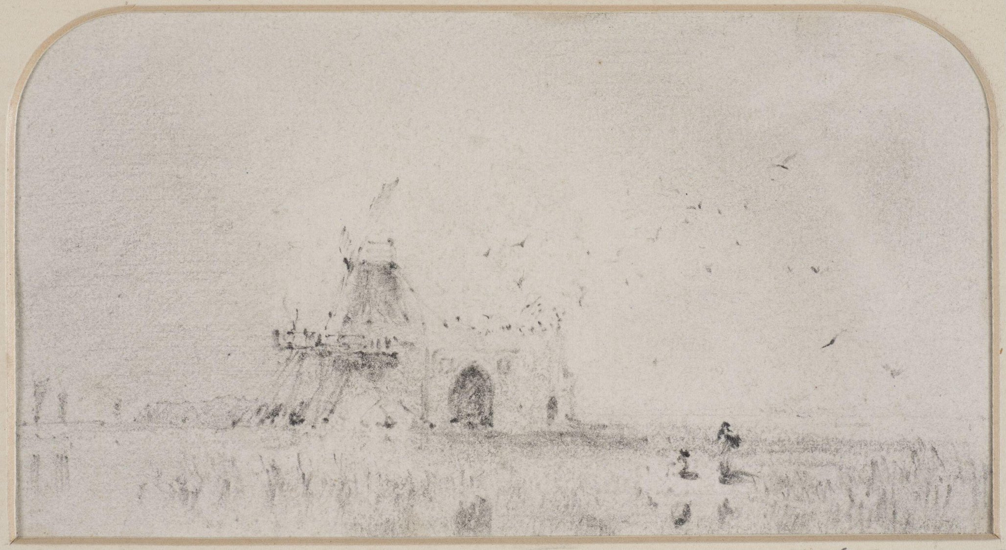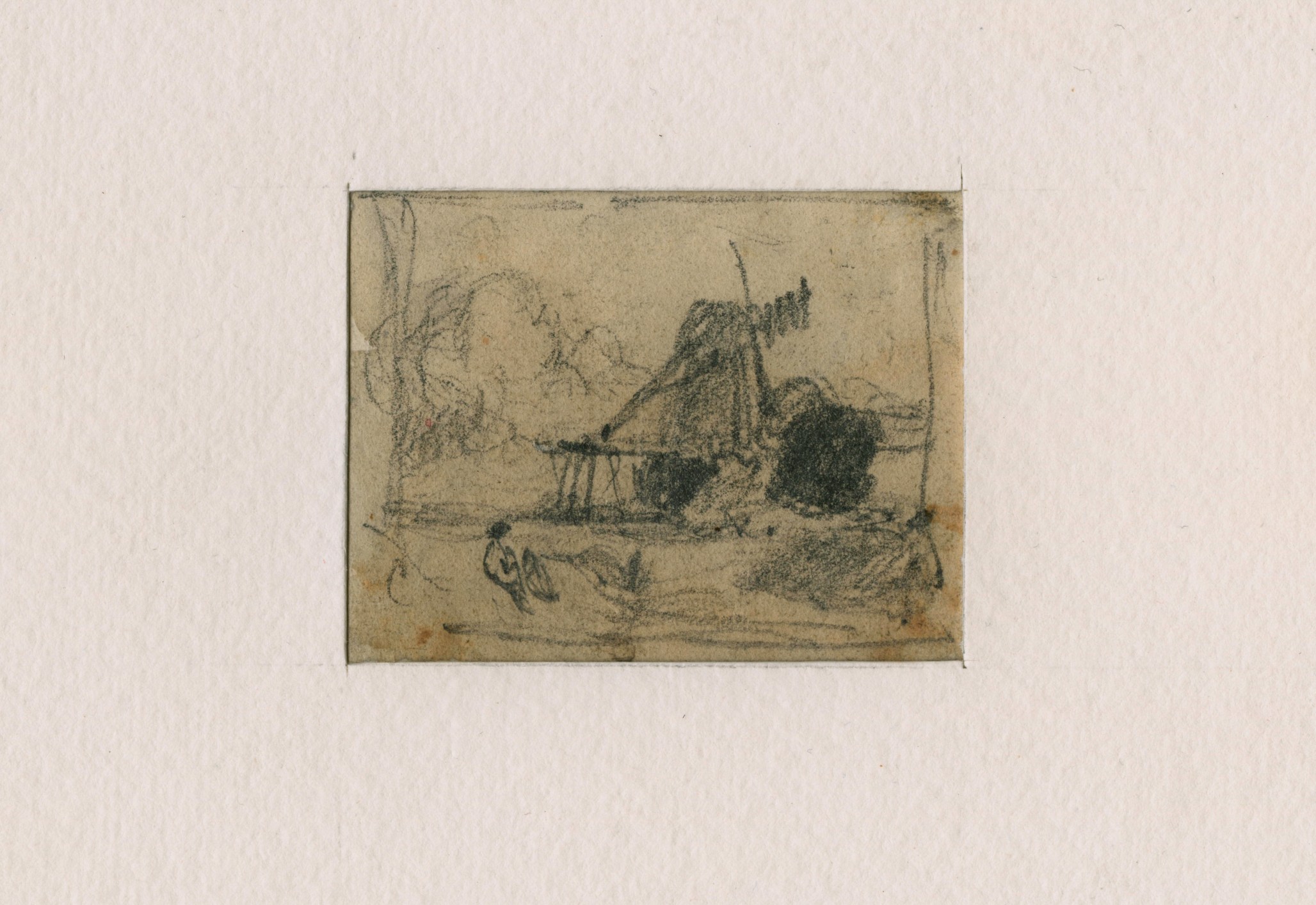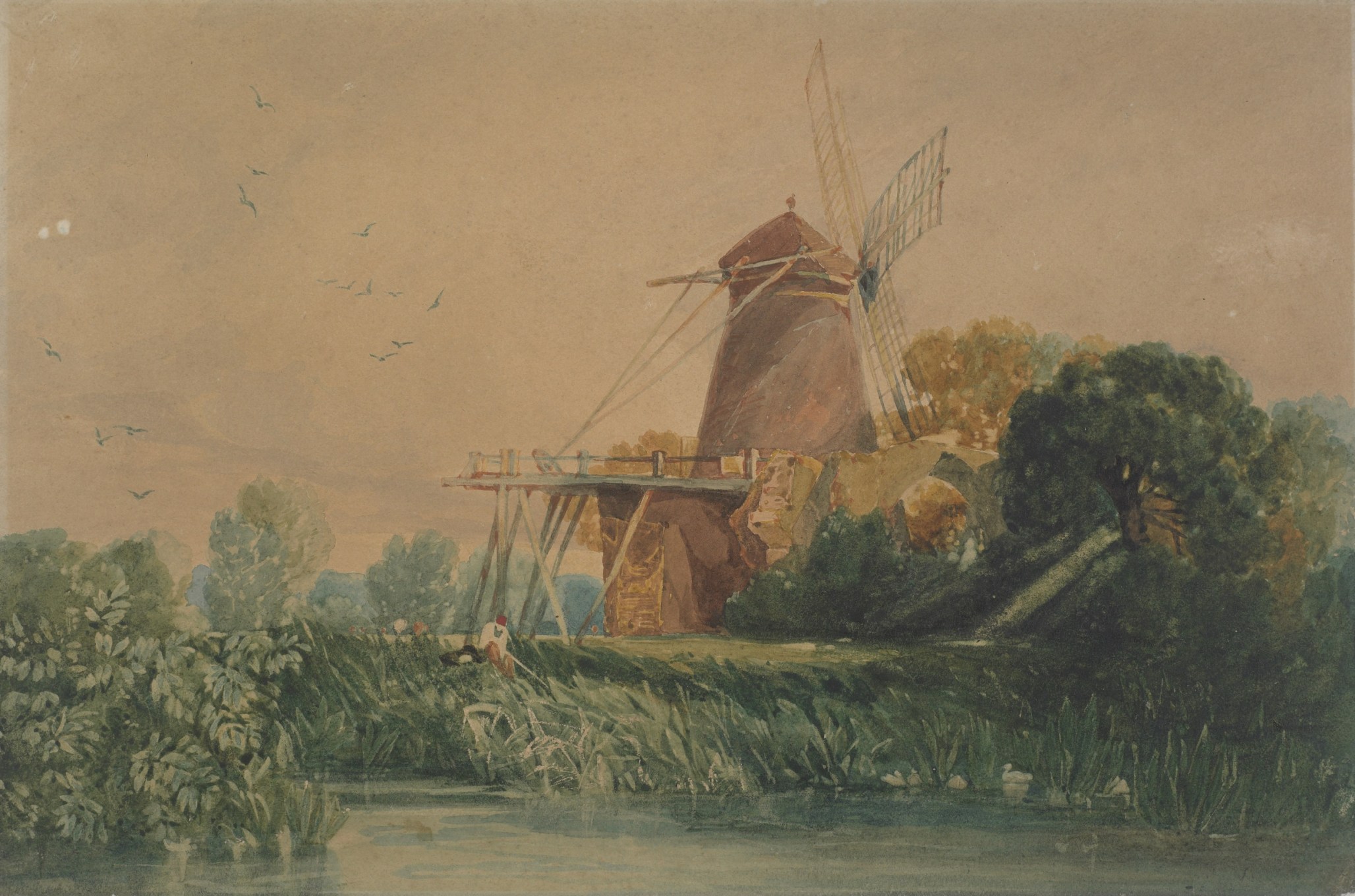 In every version prior to the 1831 watercolour the sails of the mill are angled to the left, but this sketch compares closely to the composition of the 1831 watercolour. The present drawing shares the precise profile of the windmill, but the correspondence is strong even beyond that: The watercolour is one of Cotman’s most brilliant conceptions, especially in the way that it sets its subject against an astonishing sky. The present sketch reiterates those key elements even down to the stream and figures in the foreground.