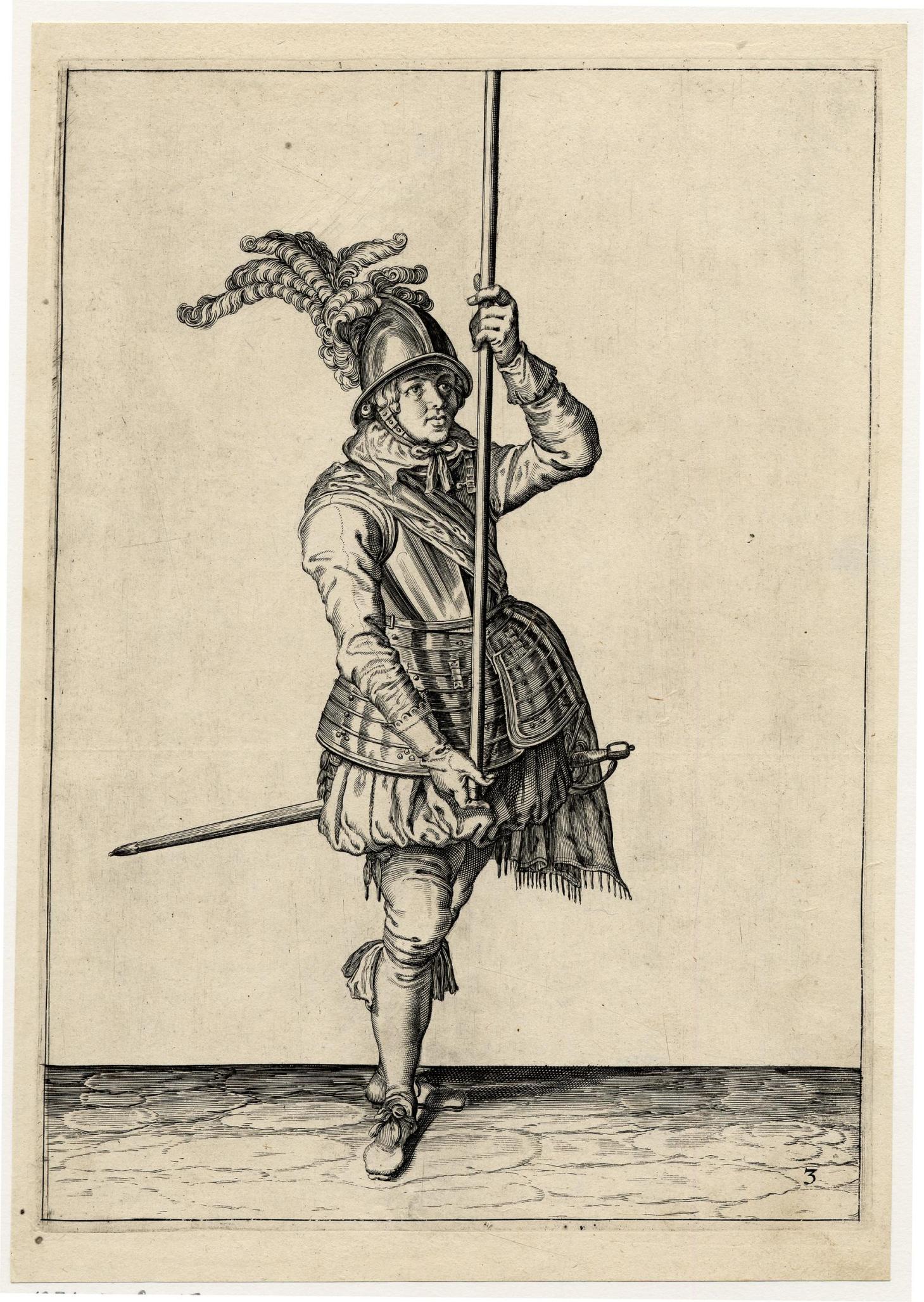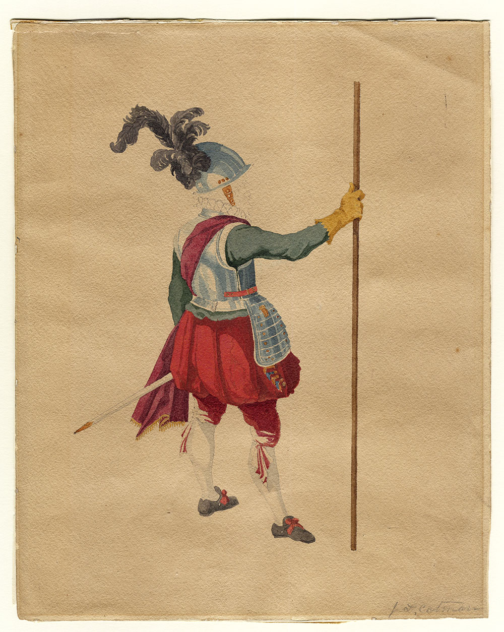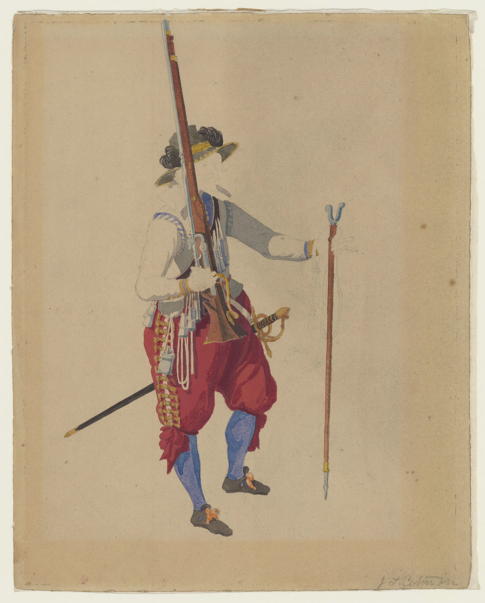 Seven other De Gheyn studies from the Cotman studio are known to current scholarship. The closest comparison to the Musketeer discussed in the previous instalment is a drawing at Norwich Castle Museum. This is based on plate 30 in the Musketeers series of the Wapenhandelinghe and there is an uncoloured example at the British Museum, besides the original impression hand-coloured by De Gheyn at the Rijksmuseum.