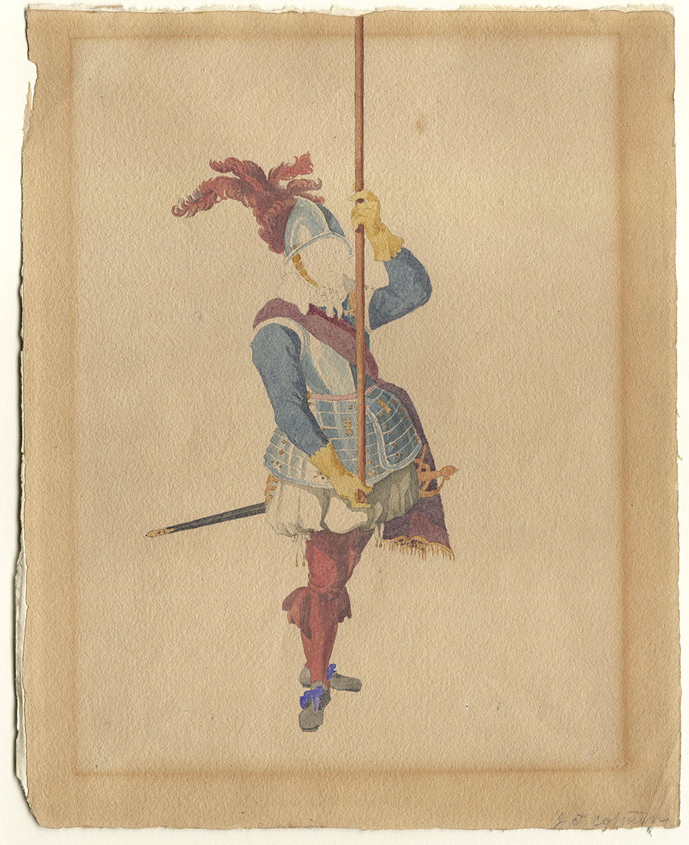 In the first (above) of two studies of pikemen at Leeds, the original is directly reconceived in terms of areas of watercolour. This is obvious in the plume, and is particularly effective in the better definition of the individual metal plates, most clearly expressed in the increased definition at left edge of the skirt.