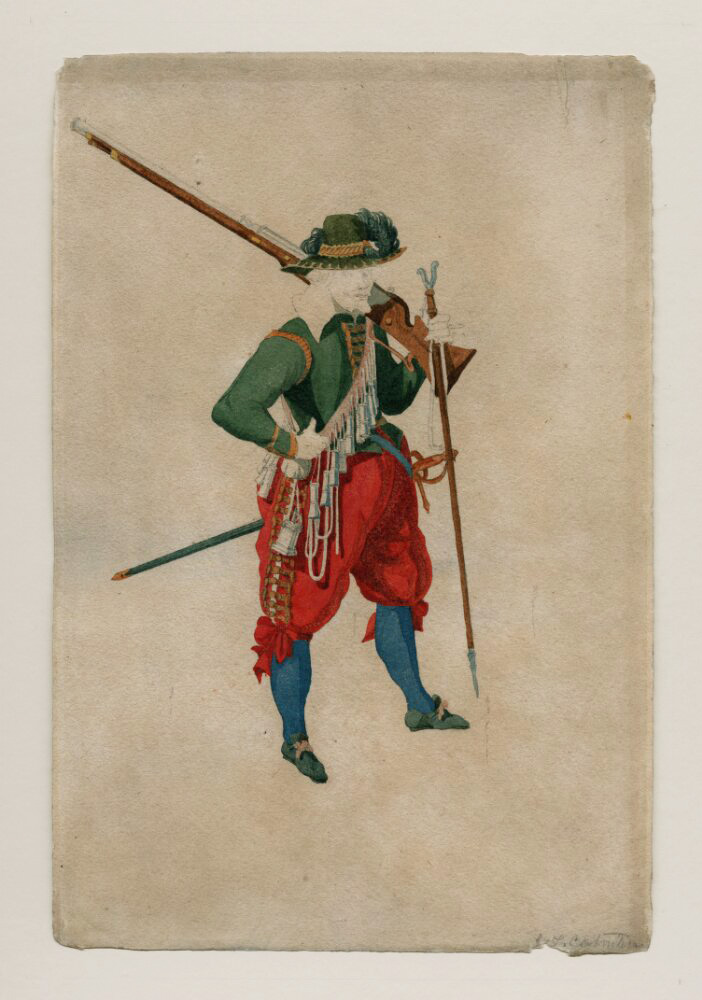 Those confidences might point more to John Sell than Miles Edmund, but, however that may be resolved, the title does allow us to separate out the various subjects of Miles Edmund’s 1825 exhibits. The Arquebusier would have worn, as here, a helmet, and no such watercolour has been identified (thus far). The two watercolours already discussed cannot be called Arquebusiers though the Musketeer with which we began has been so-called, and if that and the present example were included in the 1825 exhibits they must be identified with the ‘ Bandoliers’. Each wears an elaborate bandolier.