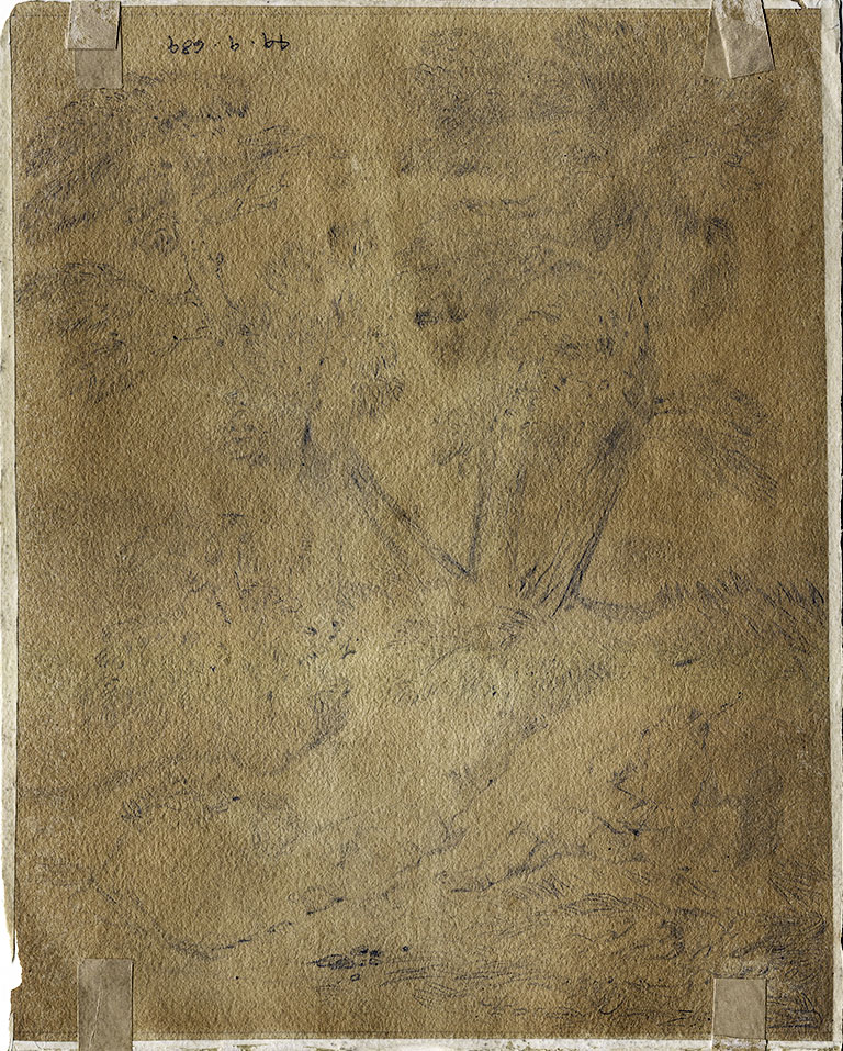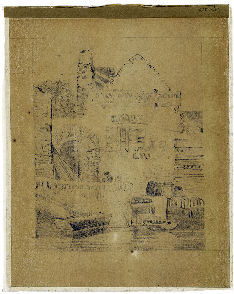 There is one further curiosity relating to the three Leeds drawings owned by Sydney Kitson: There are drawings on the versos of each. On the first is an upright pencil drawing of a building by the waterside – bearing a sign ‘C Watson Cornfactor and Maltster’. The verso of the second drawing has a slight sketch of a castle and the verso of the third has a slight sketch of a landscape with trees. All are now very faint, but with some adjustment to the photographic contrast as below we can see enough of them to see that the style is clumsy and certainly that of a pupil or pupils in the school. I here reproduce the first and third; the second somehow managed to evade photography when I was working on the Leeds collection in 2014-17.