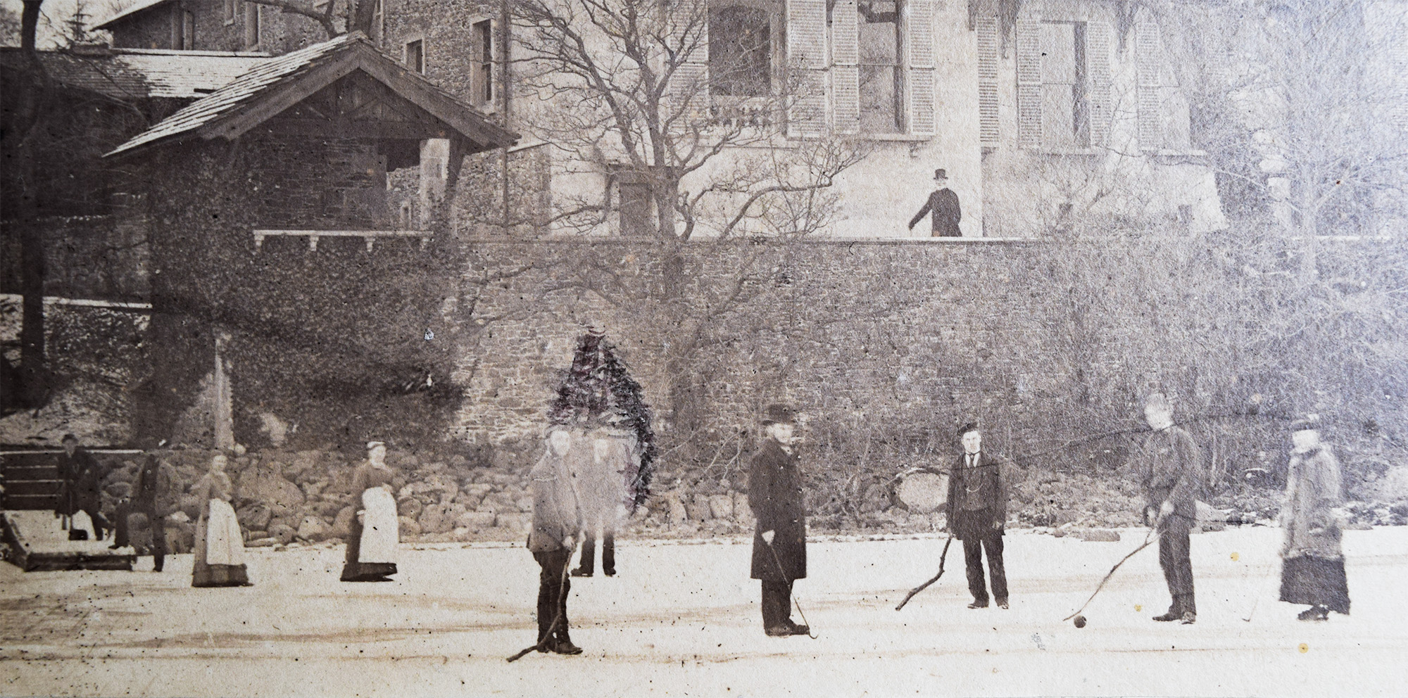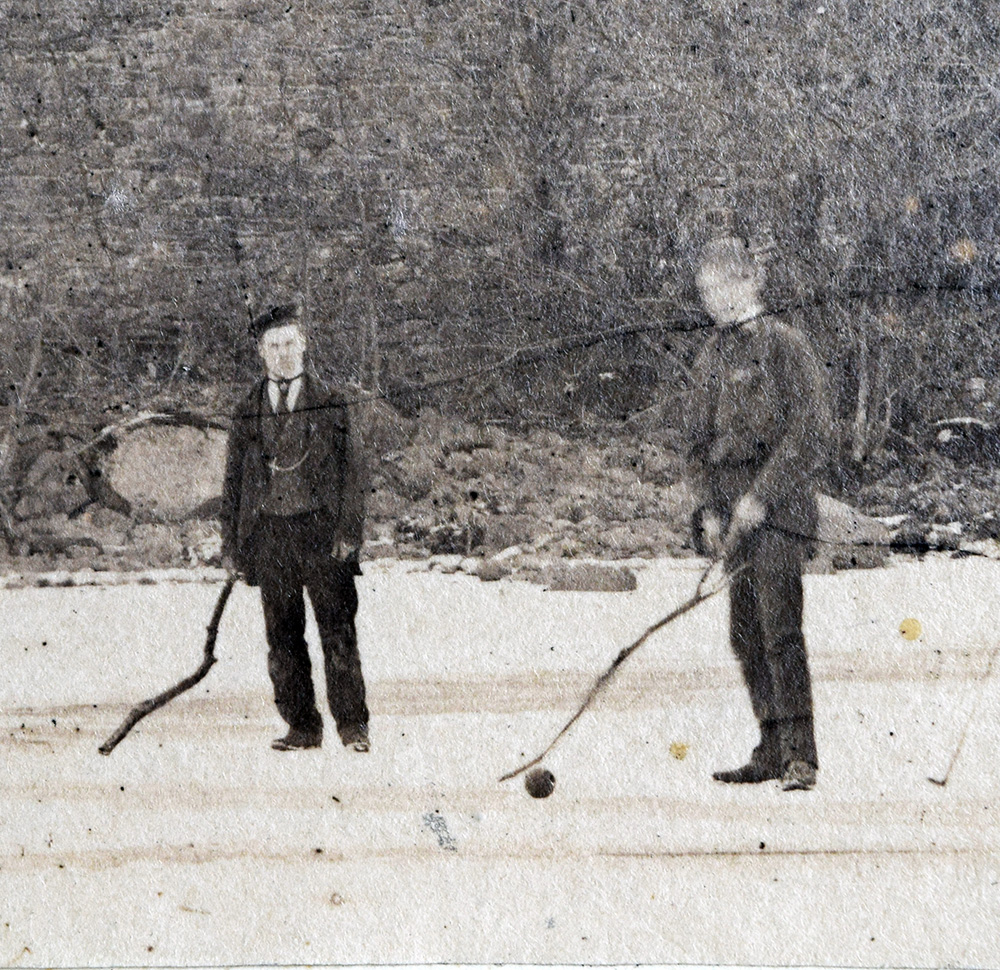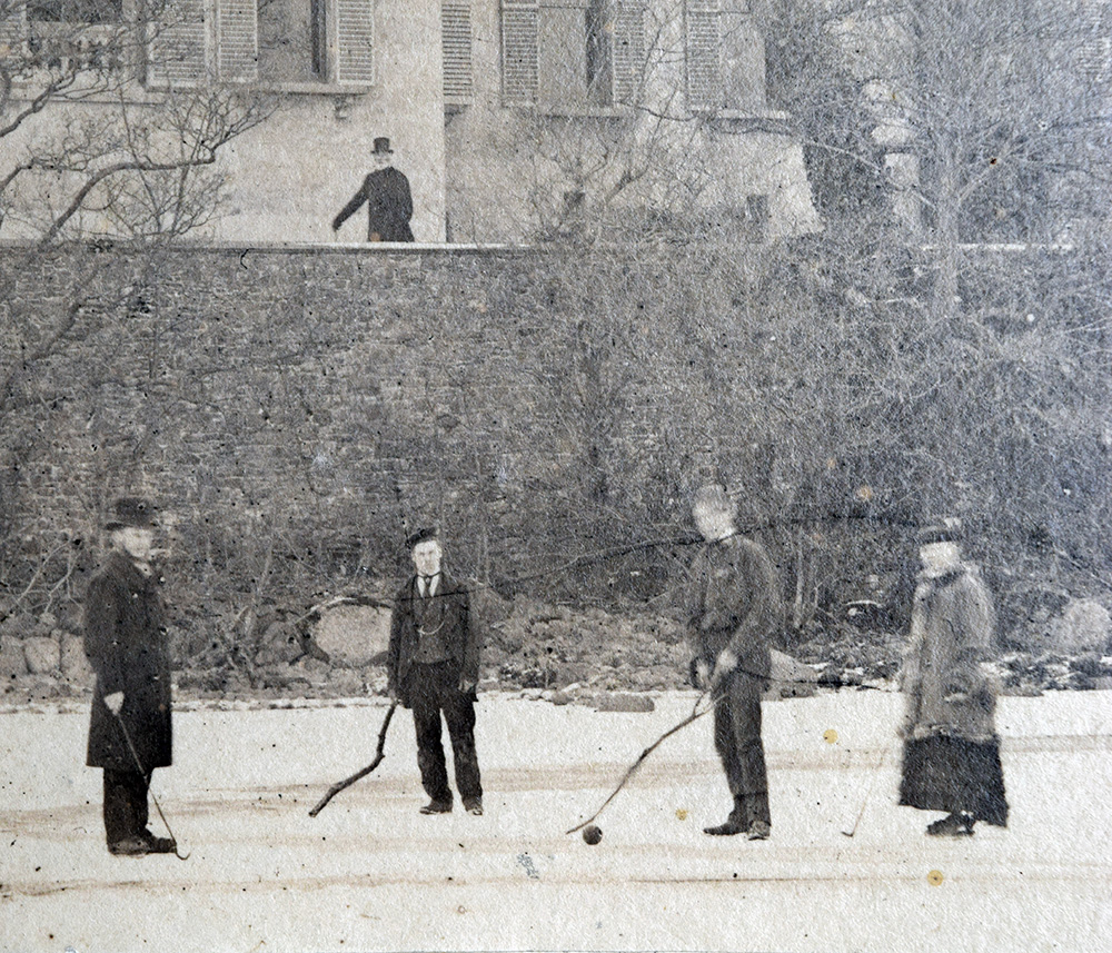 Before looking properly, I thought the party might have been playing croquet on a lawn, but on closer inspection one can see that they are playing golf on the frozen lake. The well-dressed man and woman in the foreground both carry proper clubs, albeit small irons. The paucity of equipment suggests perhaps that the sport was something of a novelty in these parts. Indeed in 1879 golf was still a novelty everywhere but in Scotland. At the time of the photograph there were still only twelve courses in England, and only one in the Lake District area, that at Furness founded in 1872. In the decade following this photograph another forty courses were founded, and in the following twenty years, hundreds more. But in 1879 the possession of golf equipment at all must have been quite radical. Not that they were quite properly equipped. There are only two proper clubs to be seen: The younger men improvise with rough branches and no-one appears to have had a proper ball, so what appears to be an old cricket ball has been pressed into service.
