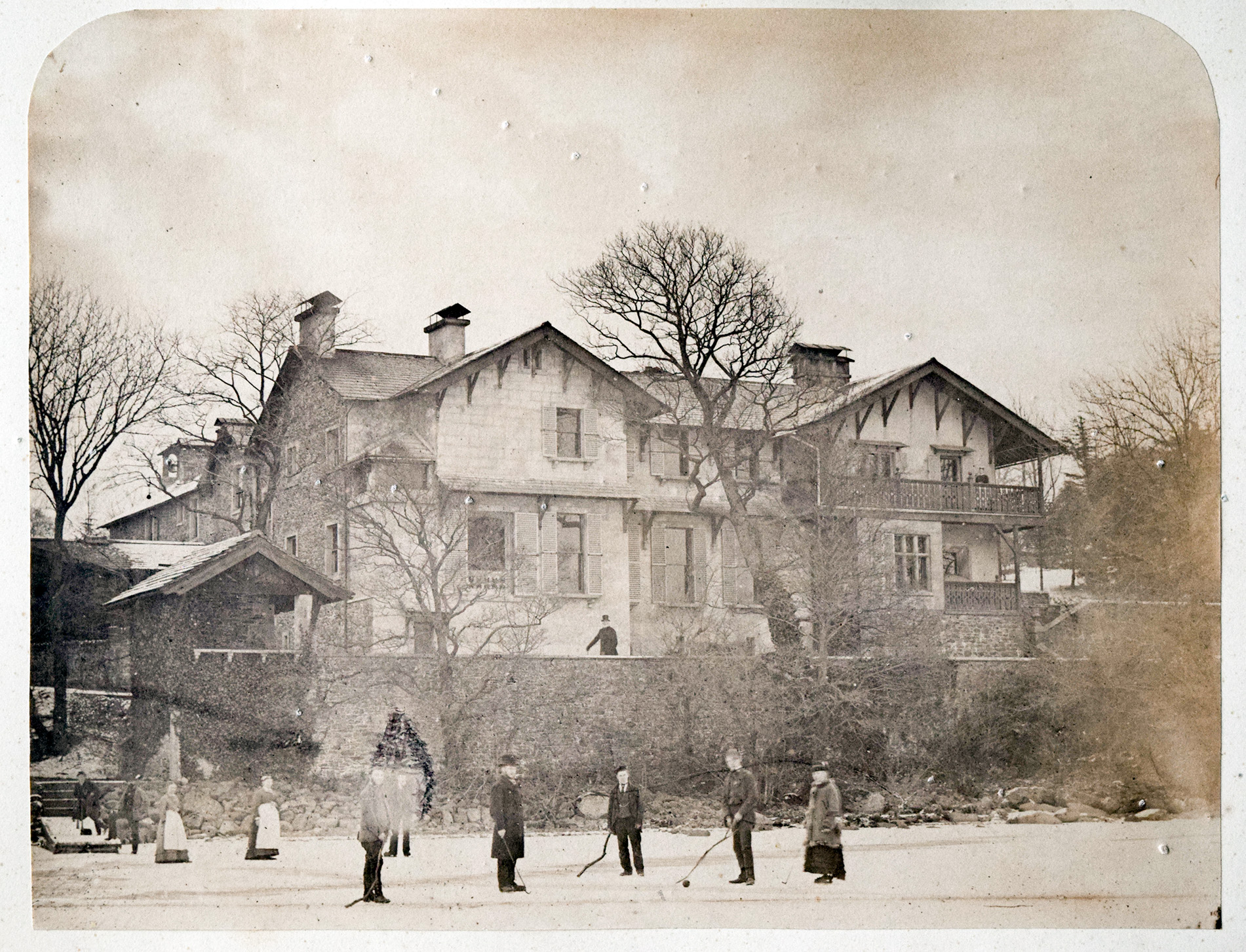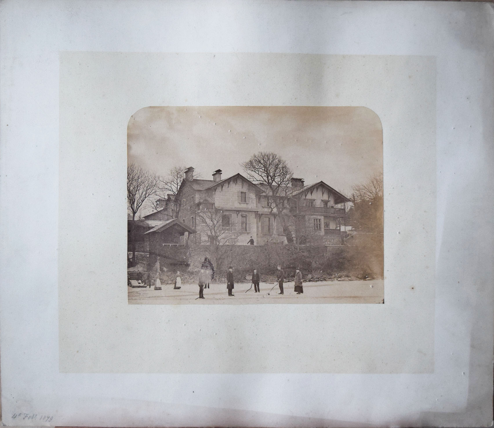 As bought, this was a random photograph amongst a random assortment of drawings. It depicts a large Swiss-style chalet, double-fronted with a terrace overlooking level ground where several figures are gathered. My first thought was that the place had a vaguely Germanic air, and might well have been a holiday souvenir. The date placed it later than almost everything else in the portfolio, and there was not even a photographer’s stamp to provide anywhere to begin.