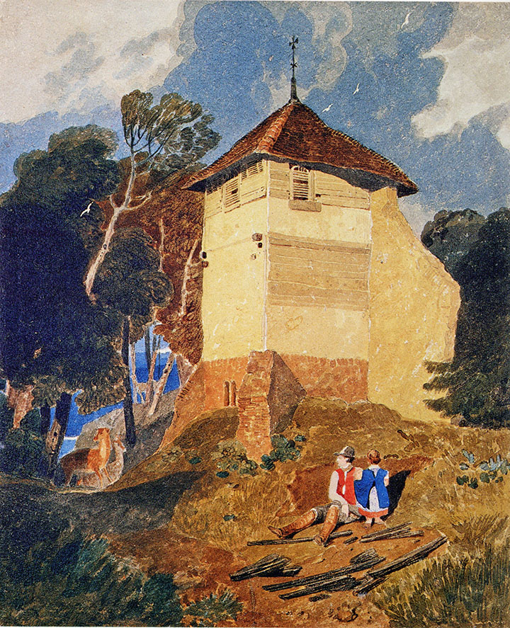 We might note in passing that Cotman adapted the figure group in reverse, from a watercolour of Kirby Bedon Tower at Norwich Castle Museum [NWHCM : 1947.217.147]. This observation was made by Miklos Rajnai in his catalogue of John Sell Cotman: Early Drawings in Norwich Castle Museum, Norfolk Museums Service, 1979, under no.94. Rajnai says that the watercolour is almost certainly that exhibited at the Norwich Society of Artists in 1810 as no.43, ‘Kirby Bedon Tower’.