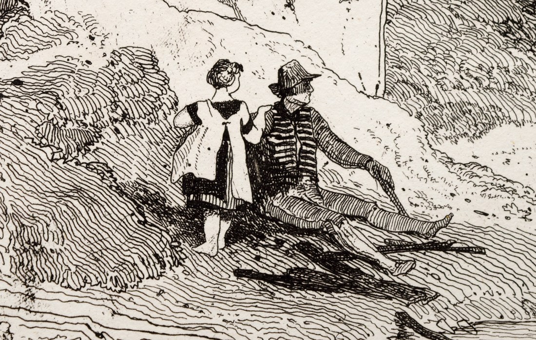 This is an impression of a copper-plate etching of an upright architectural subject featuring a pair of gothic arches supported by an octagonal column. The arches are surmounted by a crumbling masonry gable, and let into a hay barn under a rotting roof. To the left are two bays of an arcade of gothic arches supported on clustered columns and to the left the ruins of what appear to be domestic buildings. In the left foreground is a mound, possibly of debris, sloping right to a pool of water. Two figures occupy the centre of the composition; a seated man, wearing breeches, a striped waistcoat and a brimmed hat shading his eyes, and by his side stands a girl of perhaps three or four years, wearing a dark dress with a white pinafore over.