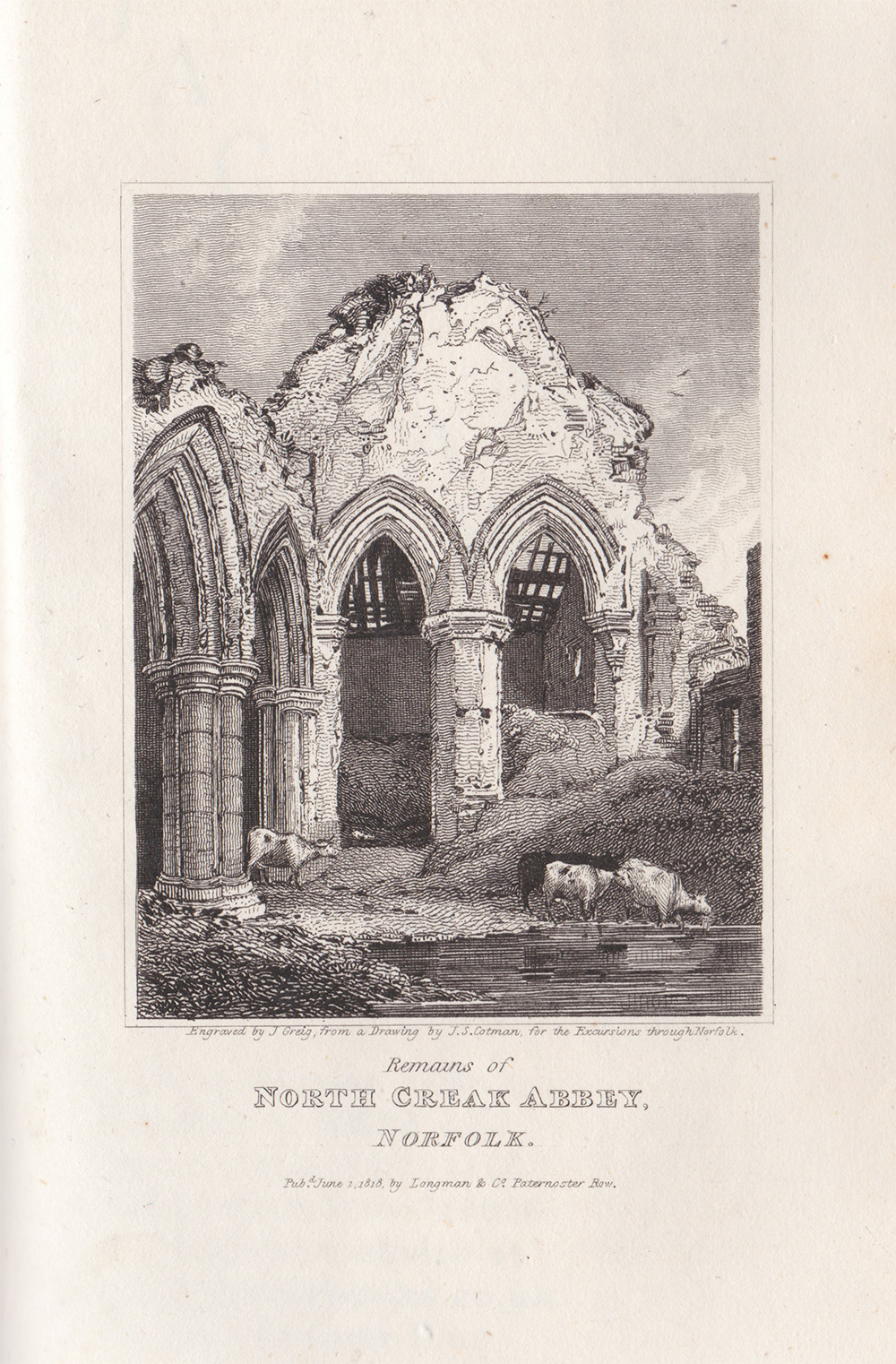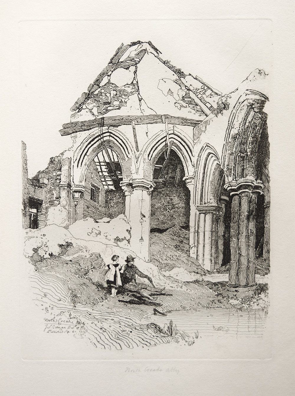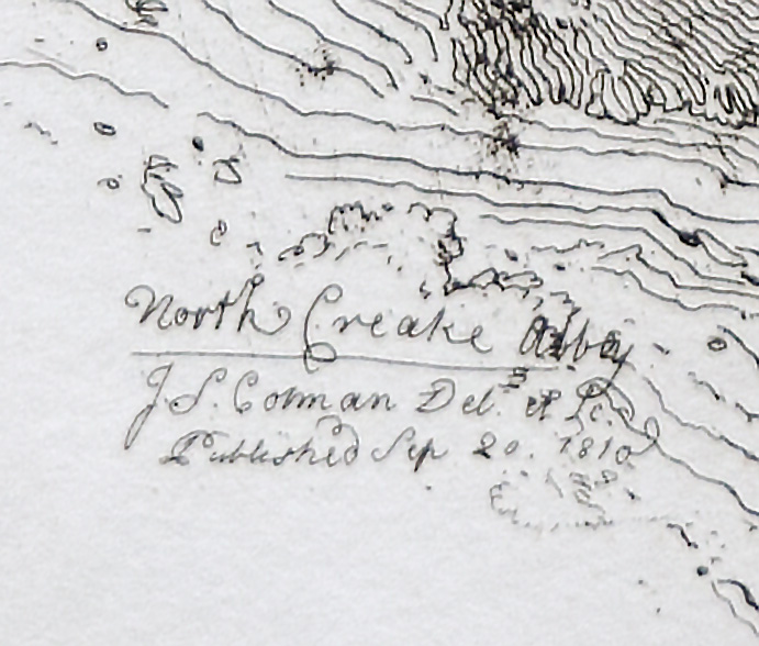 Inscribed on plate lower left: ‘North Creake Abbey/ J S Cotman Delt et Sc/ / Published Sep 20 1810’. Author’s copy inscribed by the artist in lower margin in pencil, as called for in the printed list of subjects: ‘North Creake Abbey’
