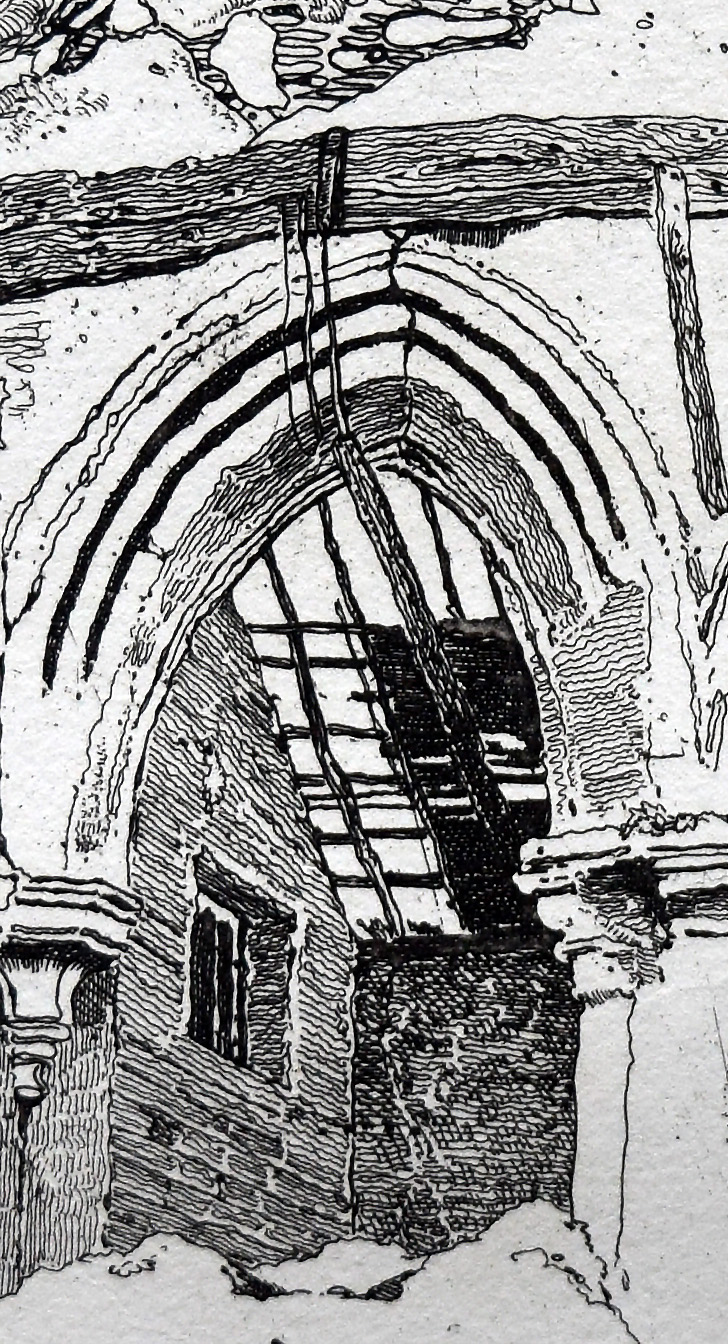 A wet February was perhaps not the best time for sketching out-of-doors, and it may be that Cotman returned later. He must certainly have visited North Norfolk again during 1808 as his courtship with Ann Miles of Felbrigg progressed towards their wedding on 6 January 1809. The time of year in the etching appears to be late summer. The space through the arches appears to be in use as a hay store, and Cotman has taken quite an interest in the improvised structure of a loft floor, which appears to have mostly collapsed, quite apart from the fact that there are gaping holes in the roof, so the space has been rendered worse than useless as a dry store. The mounds of debris all around and the parlous condition of the fabric suggest a complete impoverishment of capability.