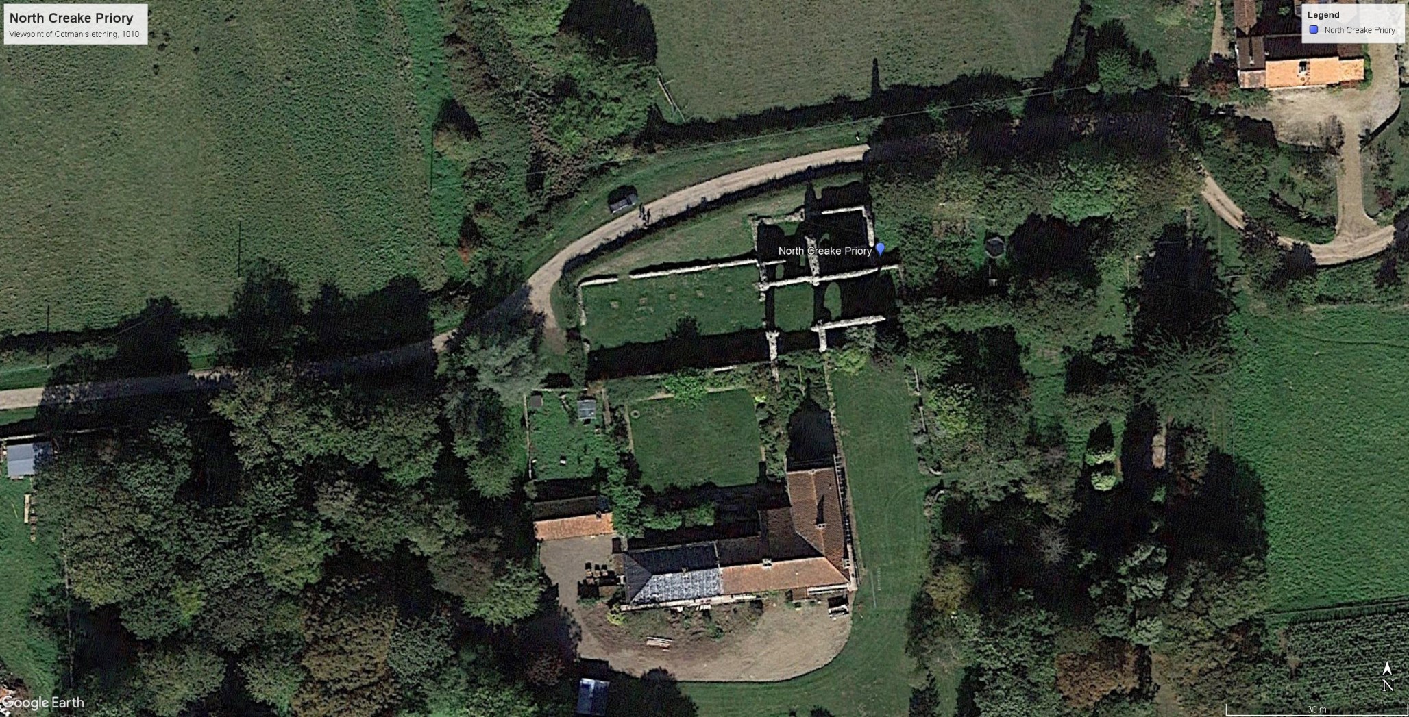 Cotman visited North Creake in the winter days of early 1808. He began composing a letter to his Yorkshire patron Francis Cholmeley on 11 February, and continued on the 22nd: ‘Since the commencement of this I have been on a visit to North Creak… Our journey was dreadful and providentially at Fakenham we were advised by the landlord to give up quitting his house that night. – In the morning we started and found the road tracked but to a certain point. We went on and on till down went the horses, and the leader compleately buried, We took the ladies out, the horses fresh kicked and plunged till they were unharnessed and dug out, for which assistance I rode to find, the moment of the catastrophe. We took another road to Basham House [i.e. East Barsham Hall]… to where we were going it was only 5 miles and we were three hours going. The ladies dined there and Mr Blythe and myself rode on to Creak 8 miles to see how the roads were, from which place men were sent to cut and track the worst parts of the road and through this assistance we arrived at Creak at 9 o’clock, having been literally the whole day going 14 miles and two days going 35.’