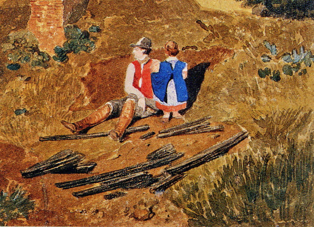 In that light the two figures appear rather pathetic. The male figure sits surveying the ruin. Maintenance of the fabric is obviously all too much for one man alone, but it appears that the site has received little attention for some considerable time. The little girl is innocent of any responsibility for any of this, and yet by implication is born to be affected by it. Manpower was a major issue in farming at this time. The history of eighteenth and nineteenth century England is one of continual migration from the land to the city. In many areas the problem was further compounded by the fact that England had been at war for decades and labour had been abstracted by the army and navy. A plausible scenario here is that the old farmer’s sons have been taken, and he is left unable to maintain the place alone.