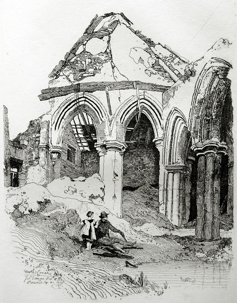 Nor is this the most obvious subject at the site. It perhaps says much about Cotman’s choice of subject that no exactly comparative photograph presents itself amongst all those online. The two arches with clustered columns, however, do survive as the south wall of the north-east chapel, but today only one of the two arches survives of the former transept. No original on-the-spot drawing by Cotman is known, but the subject must have been reversed in the etching process for the clustered columns in fact are to the left of the transept arch.