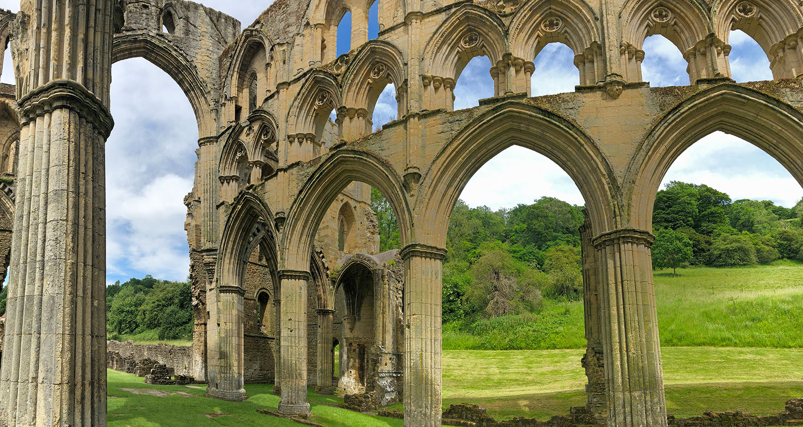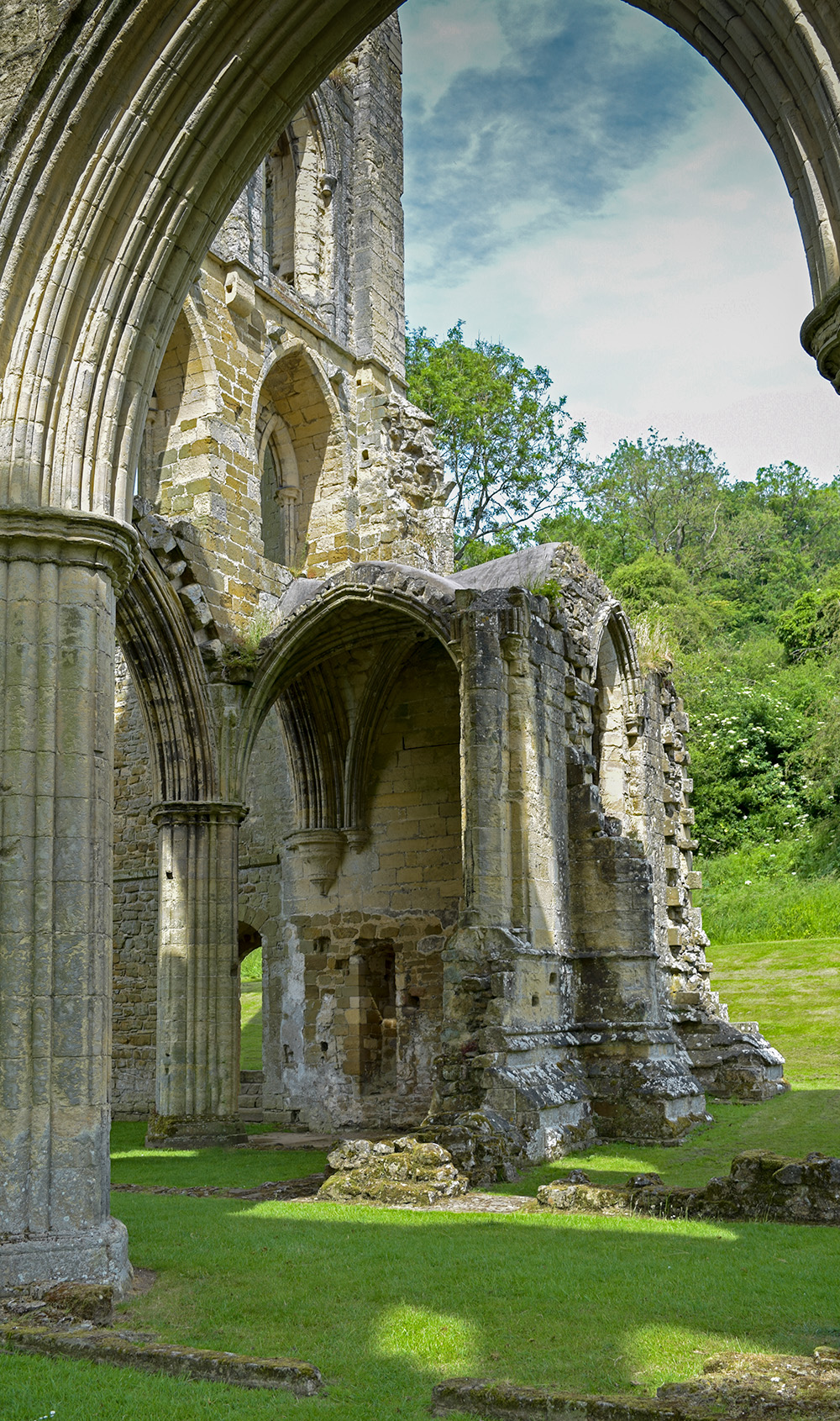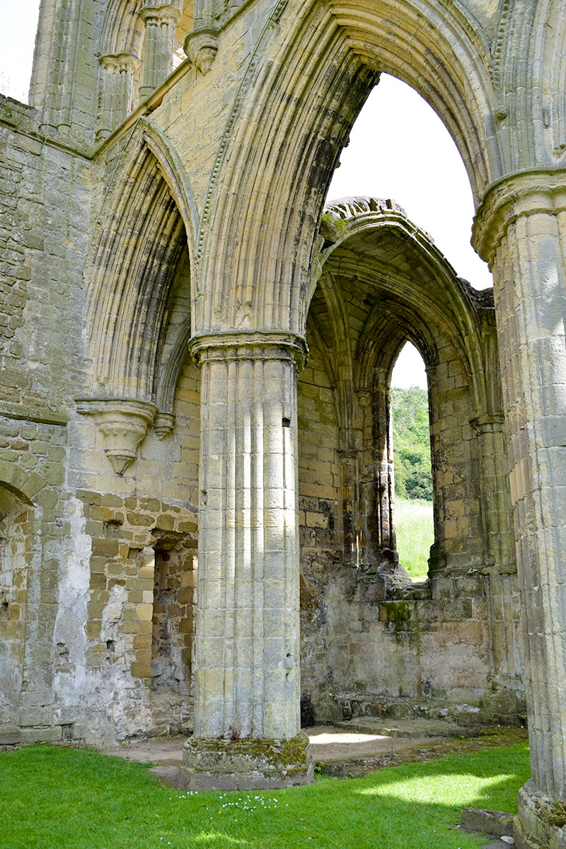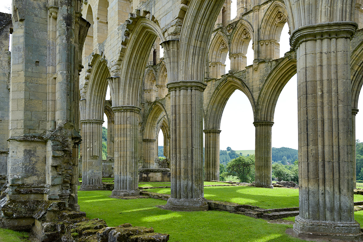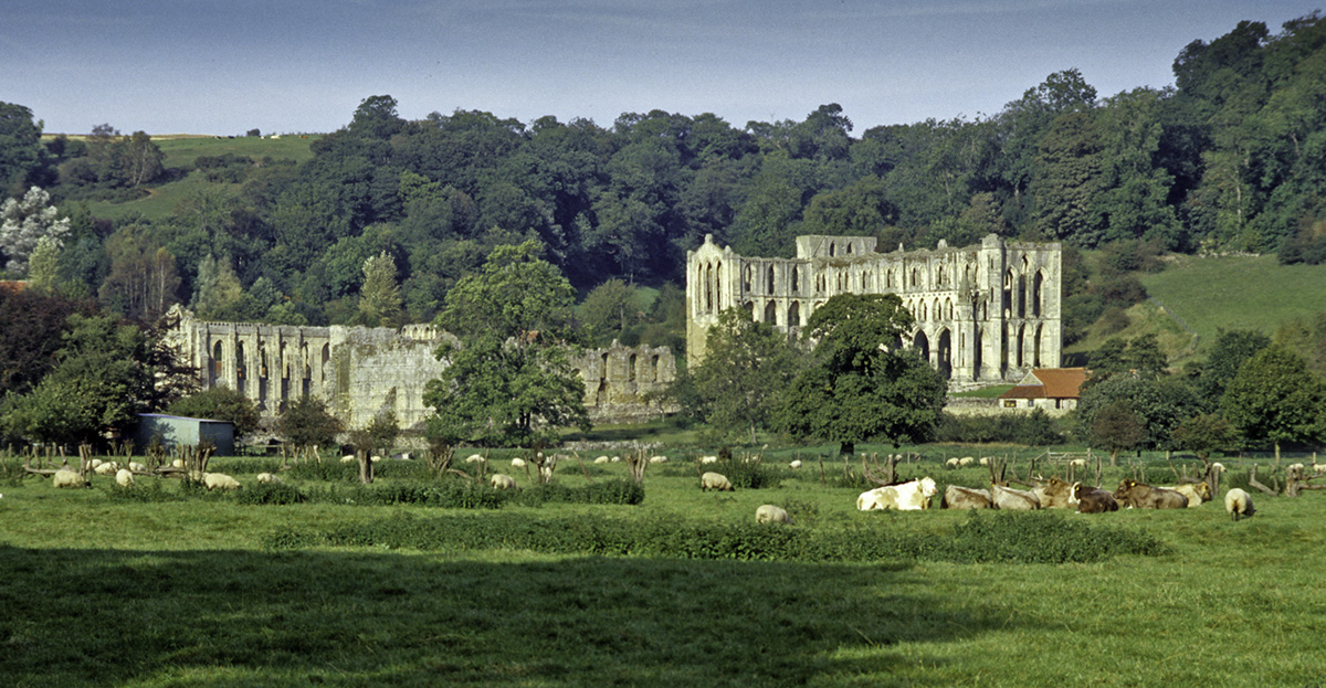 Rievaulx Abbey was the most important Cistercian house in Britain. It is still one of the most impressive of all monastic sites. This depends only in part upon the beauty and extent of the architectural remains, but equally on its remarkably sequestered location. It hides away in upper Ryedale, protected by a maze of narrow lanes, bordered by grassy banks, roadside flowers and hedgerows so profuse as to be reduced to a (small) car’s width in midsummer. The serious pilgrim should, if possible, walk – an extremely pleasant hour or two from nearby Helmsley.