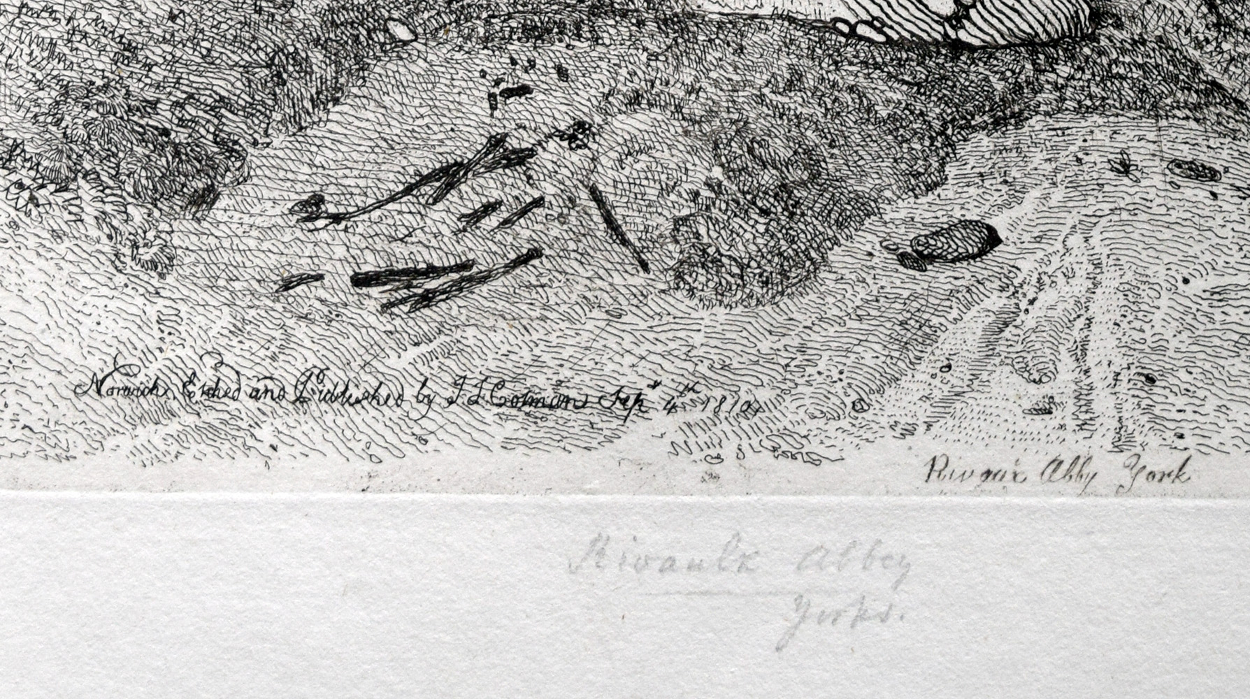 As editioned by H G Bohn in ‘Specimens of Architectural Remains in various Counties in England, but especially in Norfolk. Etched by John Sell Cotman’, 1838, Vol. 2, series 4, viii. Plate identical to 1811 edition except for correction of inscribed title lower centre, to ‘Rivaulx’, and inscribed in plate top centre, ‘VIII’. Examples in numerous collections, e.g. Norwich Castle Museum, NWHCM : 1923.86.10